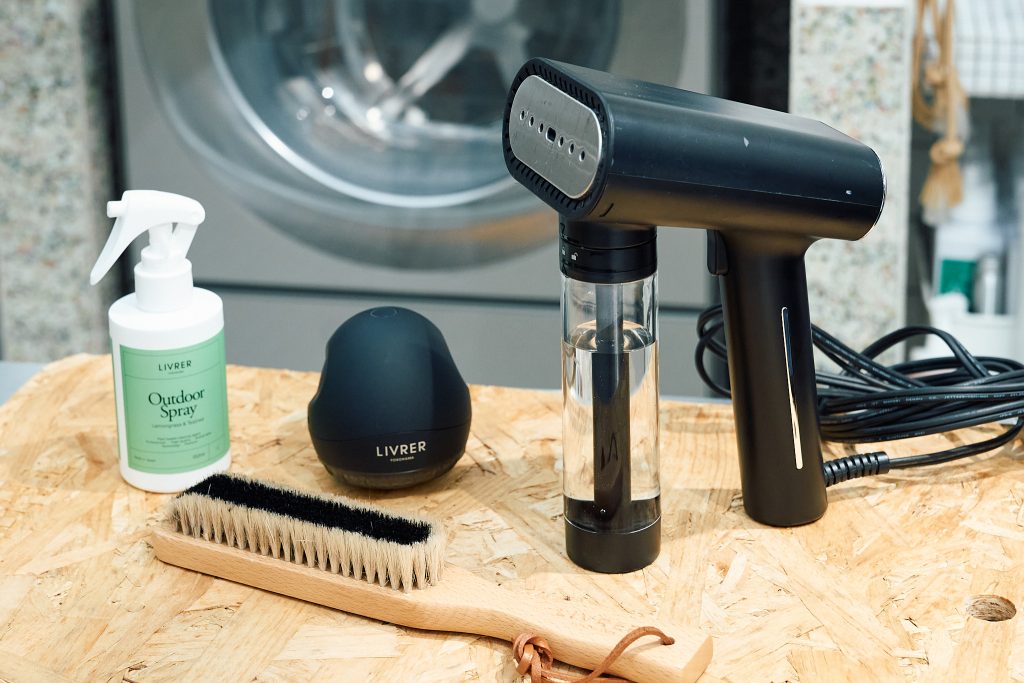 左奥から、ファブリックミスト「アウトドア リネンスプレー」¥2200、ファブリック シェイバー¥4950、SteamOne 衣類スチーマー S-Nomad ¥17600、リブレヨコハマ オリジナル クロスブラシ¥4400/リブレ