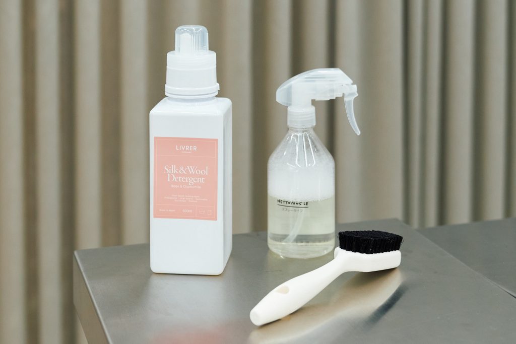 左から、ウール&デリケート製品用の洗剤「シルク&ウール ディタージェント」600ml ¥4000、霧吹きボトル(参考商品)、洗濯用ブラシ¥1650/リブレ