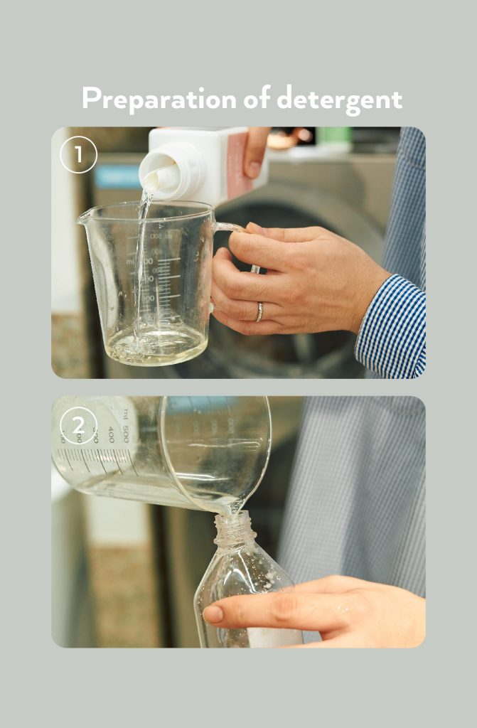 ① 水とウール&デリケート製品用の中性洗濯洗剤を1:1の比率で割る