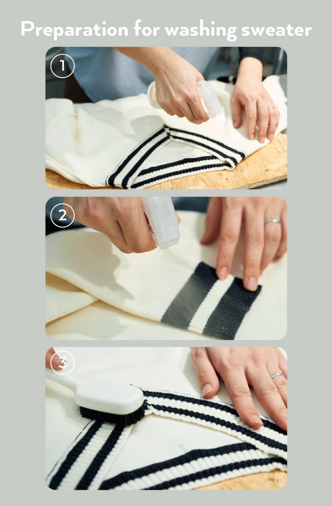 ① 下準備で作った薄めた洗剤液をセーターの襟元にまんべんなくスプレーする。