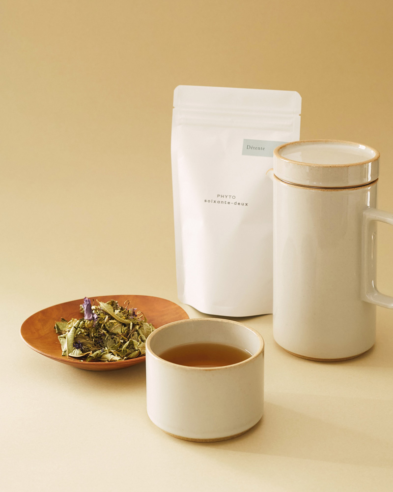 日常の中で自分の体と向き合う時間をつくるきっかけをくれる《PHYTO soixante-deux(フィト ソワソント-ドゥ)》のハーブティー。中でも「Detente(デタント)/リラックスのティザンヌ」は、癒しのひとときにぴったりな銘柄。リラックスしたいとき、気持ちを落ち着かせたいとき、どこかイライラしてしまうときはもちろん、眠りが浅いと感じるとき、消化を助けたいと思うときにも選びたいお茶。茶葉の見た目も優雅で、眺めるだけでも気分が癒されるはず。普段、家で飲むお茶はもっぱらティーバッグという人も、ときには茶葉で丁寧に淹れてみませんか? お気に入りのティーポットとカップを用意する一手間さえも楽しみとリフレッシュに繋がりそうです。