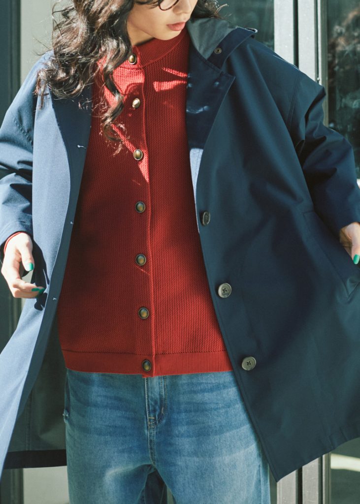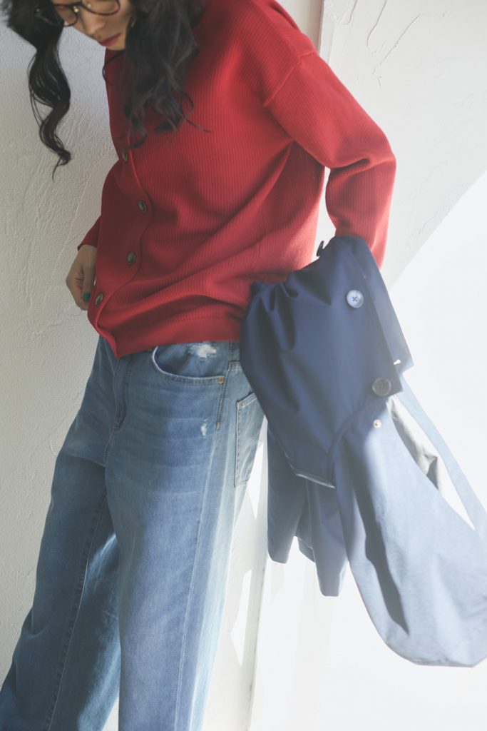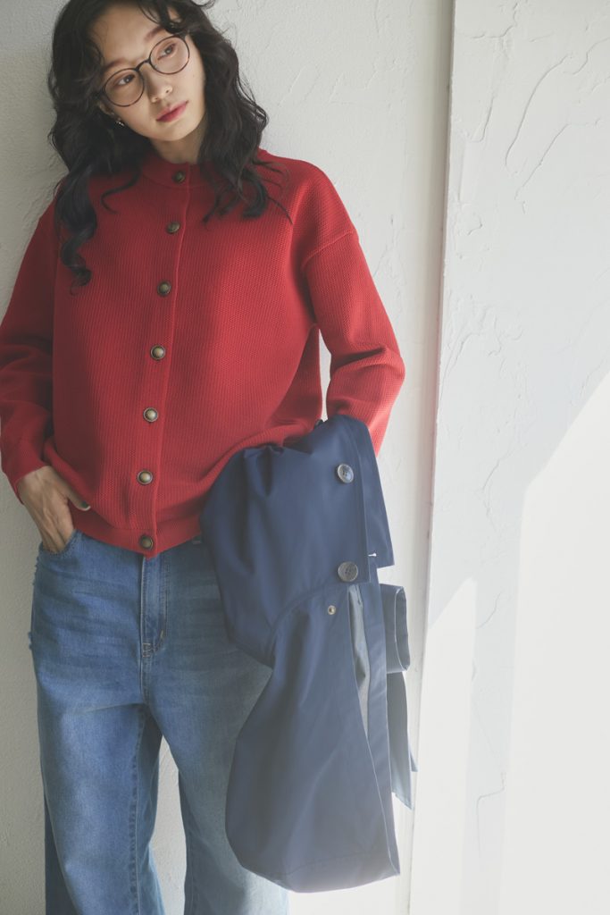 アウターの中に着たのは、ポリエステル糸で編み上げたライトな「カーディガン」と、ワードローブの新定番として追加したい「クラッシュ5Pパンツ」。鮮やかなレッドとヴィンテージライクなブルーのコントラストに心が躍ります。今の時期、どこか春の気配を感じつつも、リアルな外出時のアウターは、ウールコートやダウンジャケットなどの冬物。冬アウターの中に春ムードのアイテムを忍ばせてみるのも、この時期ならではのお洒落の楽しみです。
