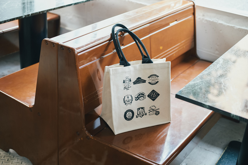 スタンプTシャツと同柄のランチトートも登場。マチが広いので見た目の印象以上にモノが収納でき、お弁当バッグとしてはもちろん、ちょっとしたおでかけの際にも活躍するサイズ感です。しっかりとしたキャンバス生地を使用しているので、タンブラーやペットボトルを入れても安定感があり、たっぷり荷物を入れても持ちやすいように一般的なミニトートよりも長めのハンドルを施したところもこだわりです。