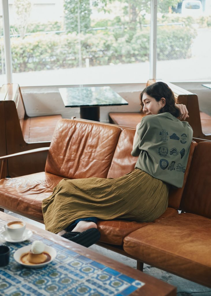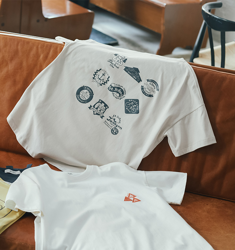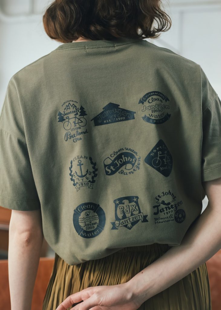 イナキヨシコさんとのコラボレーションTシャツ、2柄めは「スタンプTシャツ」。ジャンセン発祥の地・ポートランドを象徴するモチーフをアイコニックにデザインし、10個のスタンプをイメージしたグラフィックとして、Tシャツに施しました。バックプリントだけでなく、フロントの胸元にもワンポイント。スポーティでアウトドアな雰囲気を醸しつつ、どこか落ち着きのある大人カジュアルなアイテムに仕上げています。