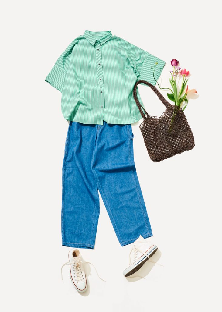 DAY01. で着用の「コットンリネンデニムペインターパンツ」の色違い。適度なゆとり具合を生かしつつ、キレイめに仕上げられたテーパードシルエットだから、チュニック風のシャツとも好相性。特に春夏らしいスタイリングを叶えてくれるブルーのデニムパンツは、グリーンのストライプシャツと合わせて配色を楽しみたい。足元はキャンバススニーカーでカジュアルに。夏場には、サンダルでより抜け感を出すのも◎。