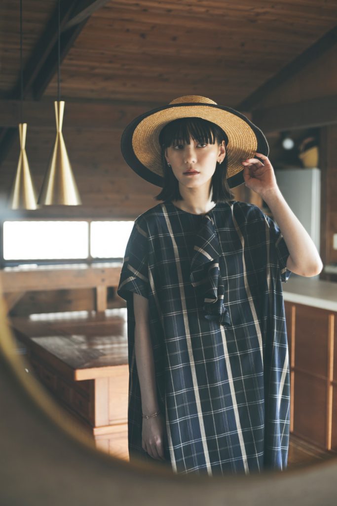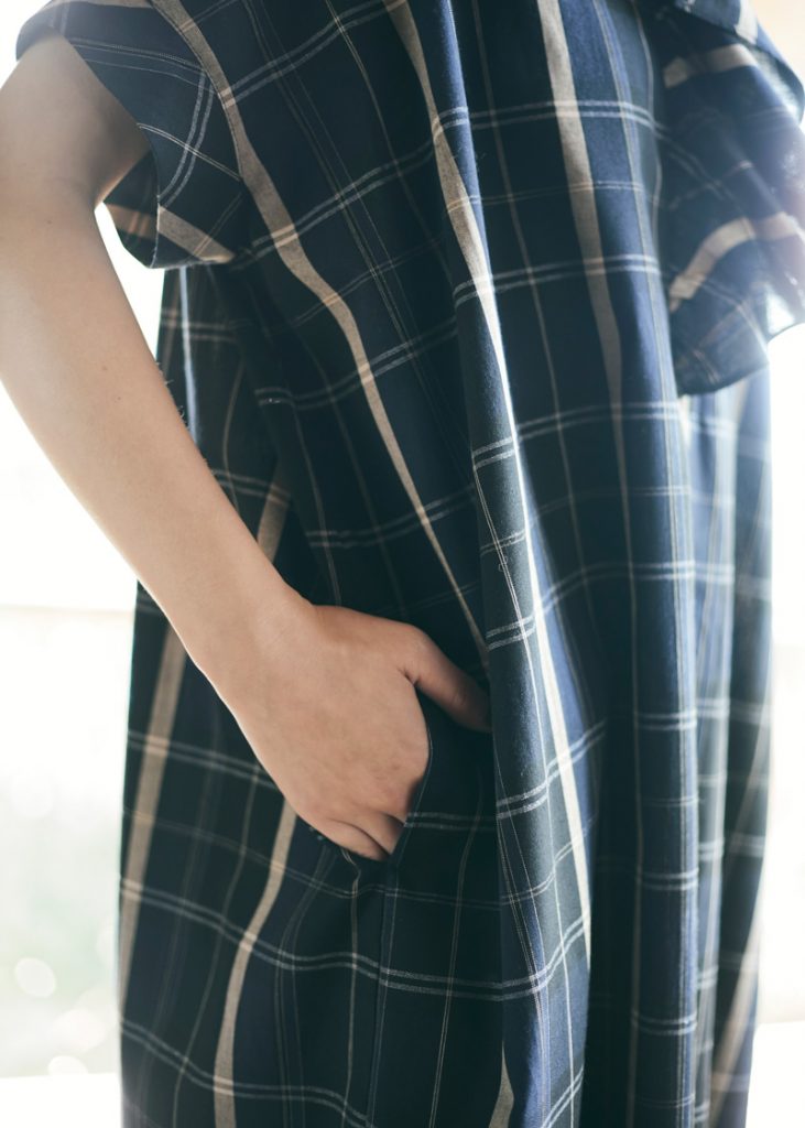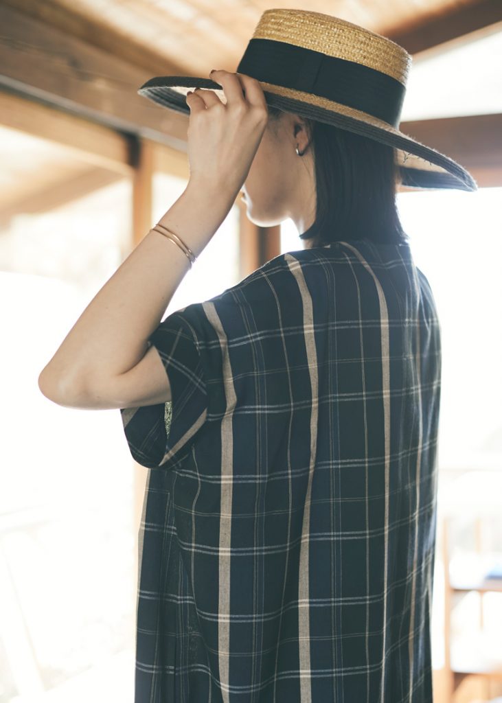 カジュアルでもラフすぎないデザインなので、普段着ベースでちょっぴりキレイめにまとめたい日の装いにも適任。ヴィンテージショップで見つけたワンピースのような佇まいも魅力です。主役級の大ぶりなチェック柄は、ダークカラーを基調とした配色で、大人でも着やすい落ち着きのあるシックなムード。スタイリングを少々締めたいときやちょっぴり変化を付けたいときには、ブラックのアイウェアやシューズを合わせたり、ブラックのカーディガンの肩掛けをしたりするのも手。ガーリーになりすぎず、レディに楽しめるチェック柄のアイテムは、このワンピースの他にプルオーバーシャツ(401QA301)も展開。ぜひ、合わせてチェックしてみて。