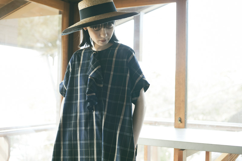 どこか懐かしいクラシカルなチェック柄のワンピース。1着でもコーディネートが決まり、リラクシーなAラインシルエットで着心地もよいので、デイリーにはもちろん、夏旅のおともにもおすすめしたいアイテムです。着こなしに華やぎを添える共布のフリルは、デザイナーが特にこだわったディテールで、まるで同柄のスカーフをコーディネートしたかのようなリュクスな仕上がり。さりげなくアクセントをプラスするロールアップデザインの袖口もポイントです。
