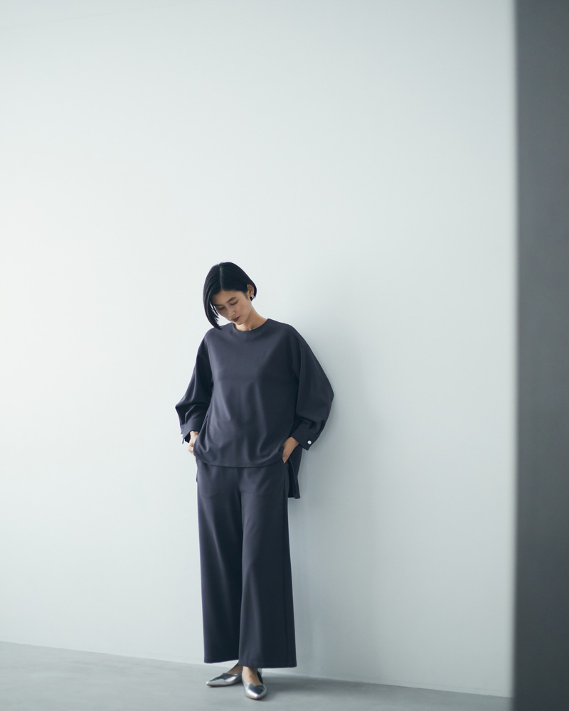 ジャンセンで定番人気のガウチョパンツが今季も登場。レーヨン混の生地は、滑らかな肌触りで履き心地がよく、ストレッチが効いているので動きやすさも◎。また、ウエスト裏に仕込んだゴムベルトで、気になるお腹周りをすっきりと見せられるところもこだわり。全3色展開で、同素材のスリムシルエットパンツ(401QC701)も発売。ブラックとチャコールは同素材のトップス(記事にてモデル着用、品番401QC302)もあり、セットアップでの着用もおすすめです。