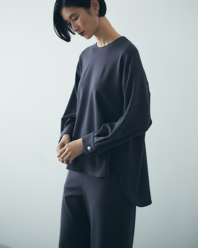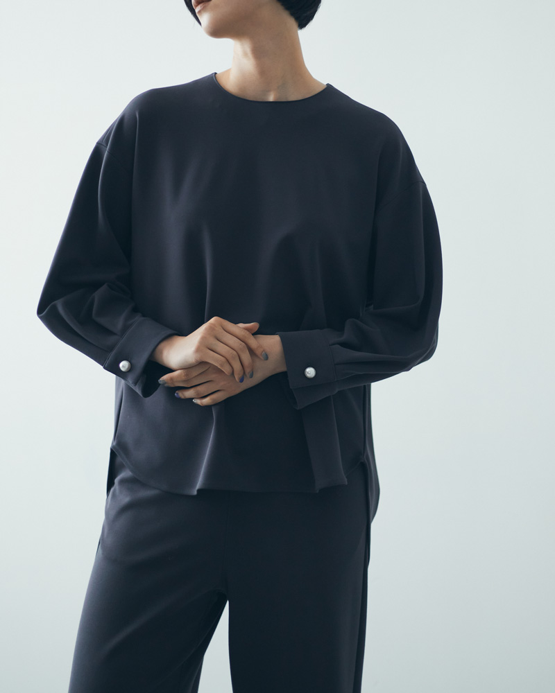 シワになりにくく扱いやすい、人気のポンチ素材のプルオーバー。袖口のパールボタンが、着こなしに上品なアクセントをプラス。体のラインを拾いすぎず、リラクシーな着こなしを叶えるゆったりとしたサイジングで、気になる腰~ヒップをさりげなくカバーできるよう、後ろ身頃が長めの丈になっています。全3色展開。うち2色は、同素材のスリムパンツ(品番401QC701)とガウチョパンツ(記事にてモデル着用、品番401QC700)も。セットアップでの着用もおすすめです。