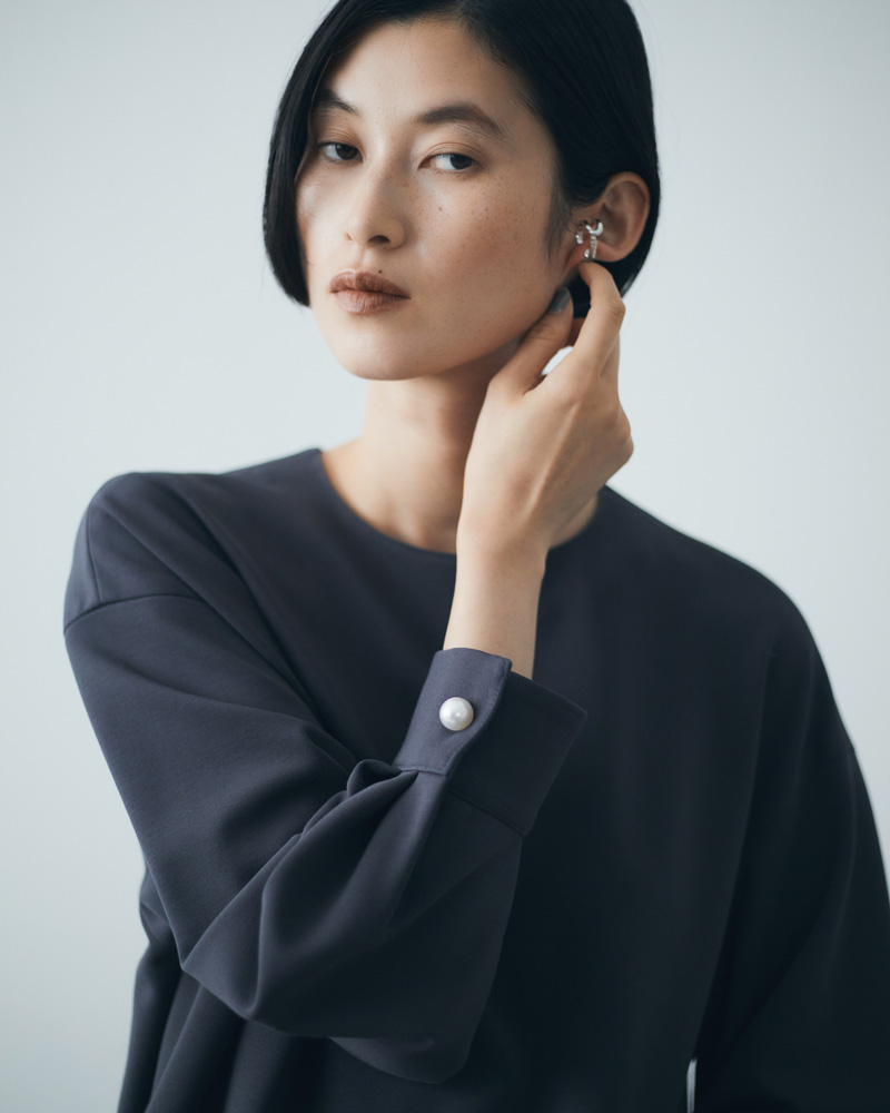 好評のポンチ素材を使った新作がお目見え。シマーな光沢感が上品な「ポンチパール釦プルオーバー」と「ポンチガウチョパンツ」は、セットアップでも着こなせる同素材での展開です。残暑はあれど秋の気配が漂うこの頃、まず手にいれるなら、手持ちの服とも合わせやすくて、スタイリングの幅を広げられるこんなアイテムが一押し。トップスは、ゆったりとしたサイジングで、後ろ身頃が長めの仕様になっています。袖口にはパールボタンを配すことで、アクセントもプラス。落ち着きのあるネイビーのカラーは、オフィスシーンやちょっとした会食の際にも活躍できそうです。