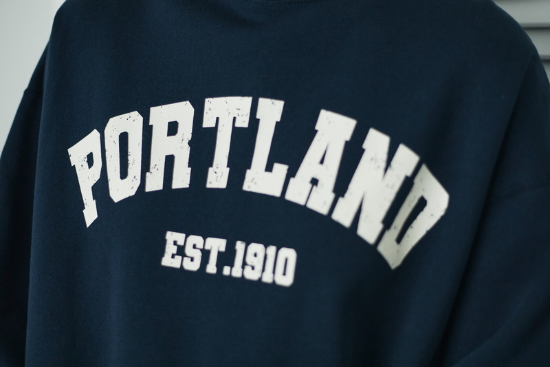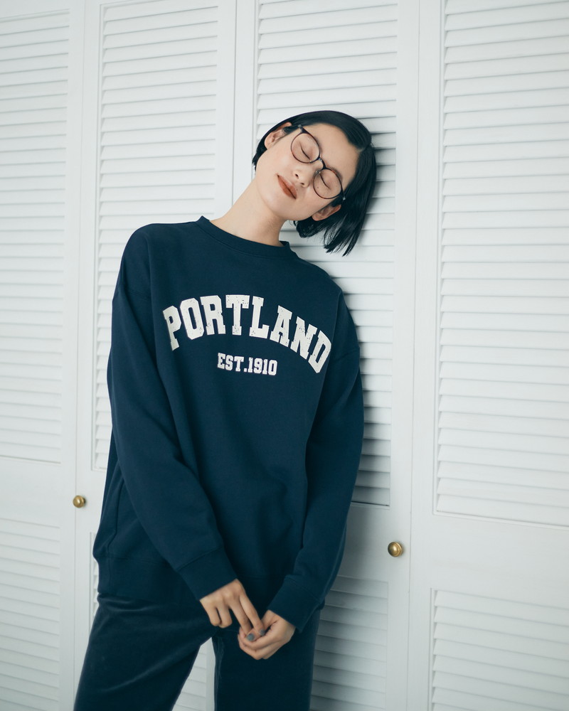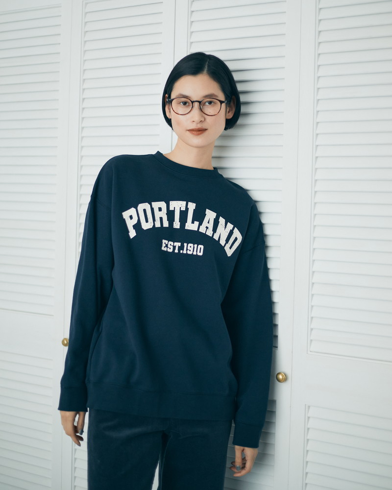 2.カレッジ感が可愛いネイビーのスウェットプルオーバーには、ジャンセン発祥の地である“PORTLAND”のグラフィックをプリントしています。味のあるかすれプリントも着こなしのポイントに。