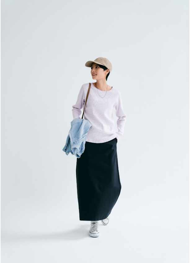 もう1つの着回しアイテムは、表面にさりげない光沢感がありキレイめな印象の「ロングタイトスカート」。ストレッチが効いた素材感で動きやすく、ややハイウエストの設定でトップスインするとスタイルアップ効果も◎。ウエストは楽に穿ける総ゴム仕上げ。お腹周りがもたつきにくい幅広のゴムを使用しています。