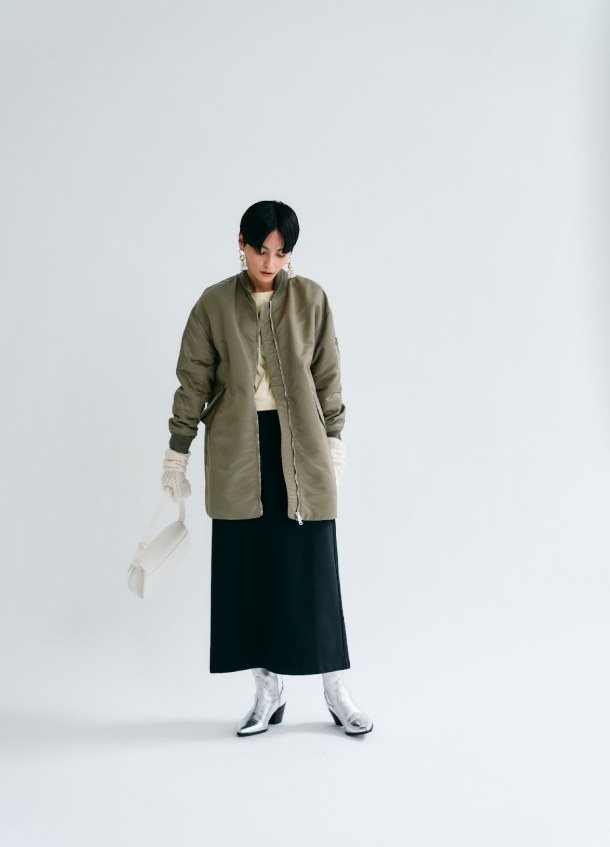 例えば、いつものパンツ代わりに黒の「タイトロングスカート」を選んでみるアイデア。新作MA-1とも好相性で、カジュアルの中にエレガントさを醸す気の利いた大人スタイルが完成。アウターのサテンライクな光沢感と落ち着きのある黒のメリハリが◎。