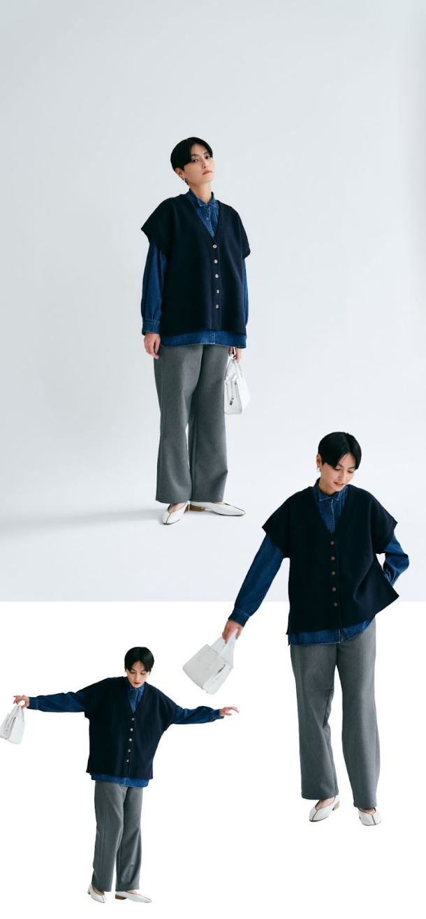 ドロップショルダーでゆったりとしたシルエットのニット「ベスト」は、“ダブルフェイス編み”というしっかり目の編み地で形崩れしにくい仕立てです。素材は軽くて扱いやすいポリエステル糸を使用。手持ちのトップスに重ねるだけで雰囲気をガラリと変え、新鮮な着こなしで楽しめるアイテム。