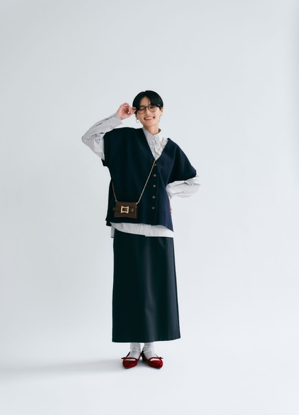 着回しアイテムのベスト¥8800、ストライプシャツ¥9900、着回しアイテムのロングタイトスカート¥9900/ジャンセン、その他 参考商品およびスタイリスト私物