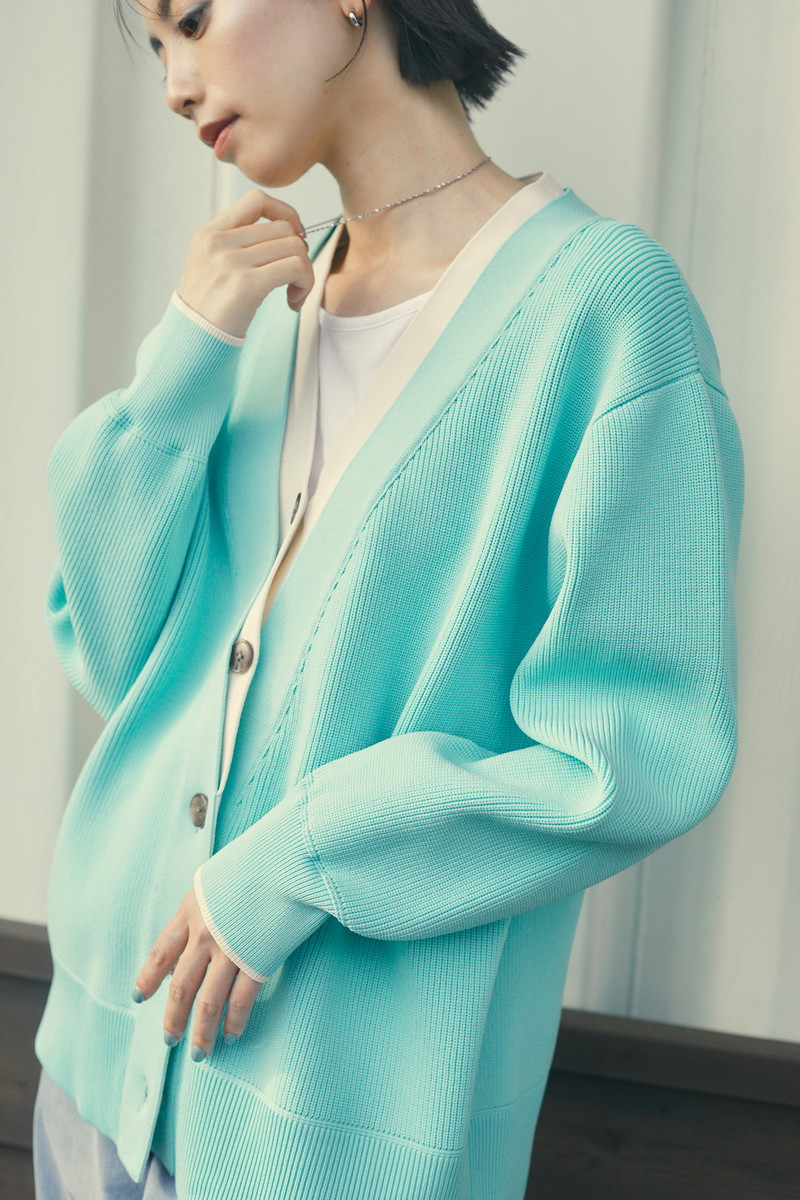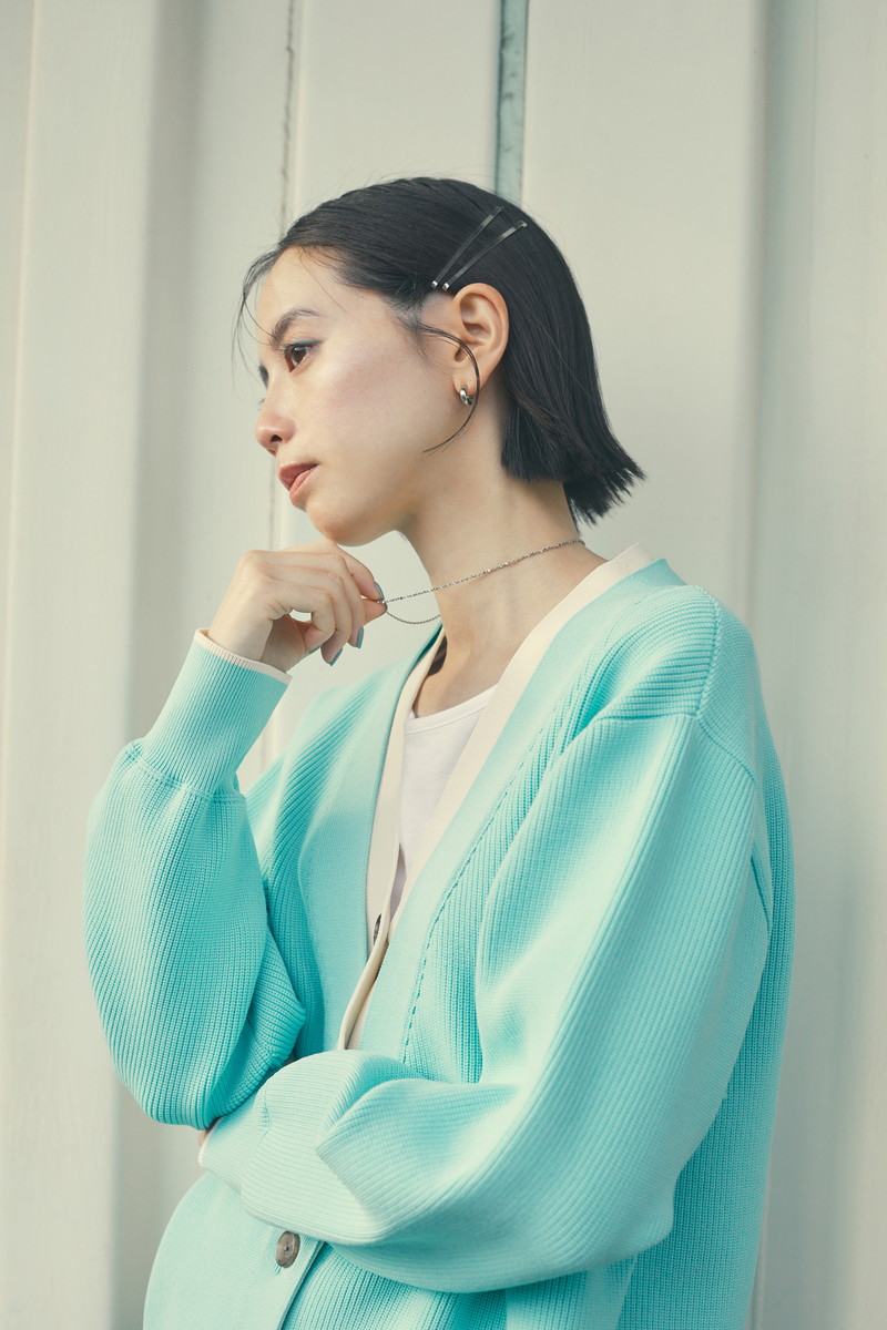 何気ないコーディネートも印象的に彩る「カーディガン」の前立てと袖口の配色。前立て部分は生地を2枚重ねた“重ね着風”のデザインで、着こなしに奥行きを演出。身頃や袖の編み地はカジュアルすぎず上品に着られるようないい具合のリブ編みで仕立てました。