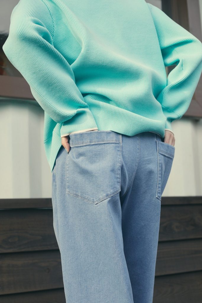 合わせた「デニムパンツ」は、テーパードをアレンジしたようなカーヴィーラインが特徴で、カジュアルさの中にさりげなく女らしさを醸す1着。洒落感と楽な穿き心地を両立する適度にゆったりとしたシルエット&総ゴムウエストで、普段のオシャレをサポート。シンプルスタイルにワンクッション欲しいときの相棒としても◎。
