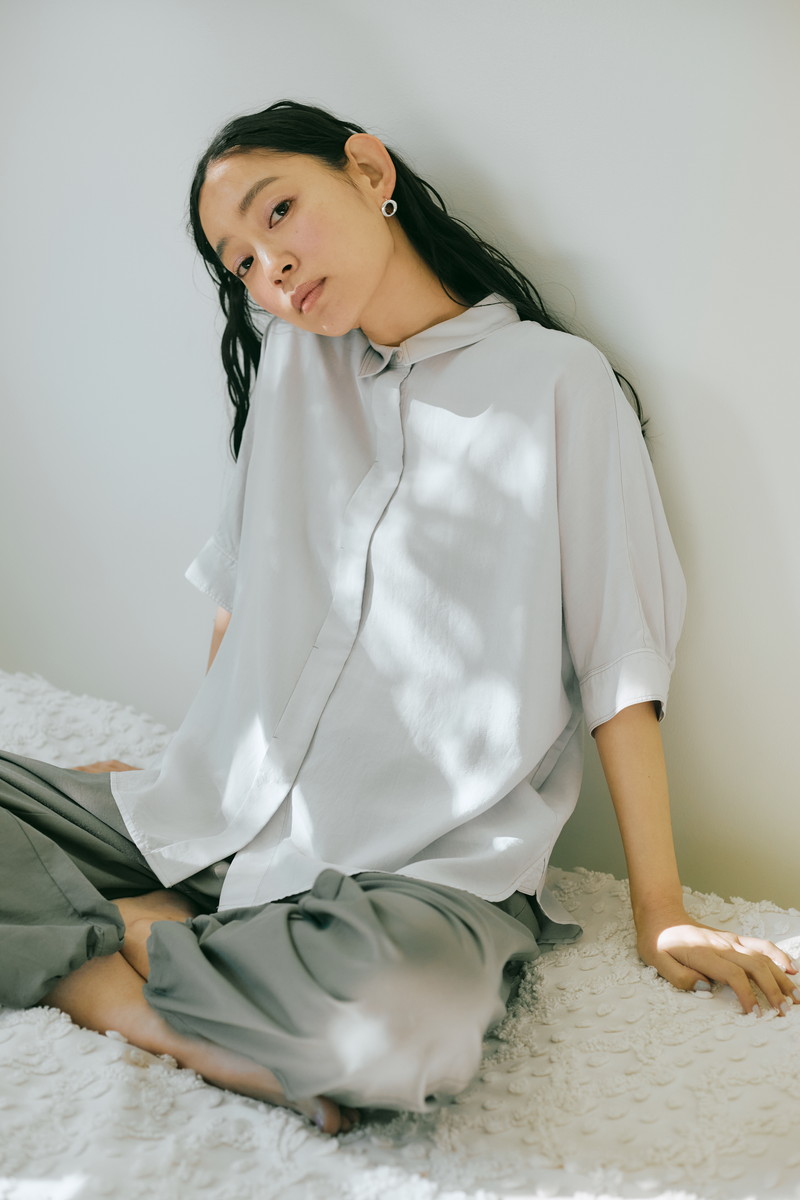 エコ素材で涼しい着心地のリヨセル(※)を使ったブラウス。リヨセルの原料となるのはジャイアントジュニパーという植物。デイリーに使いやすい適度にゆとりのあるシルエットで、二の腕周りもスマートにカバー。サンドウォッシュ加工を施すことでニュアンスのある風合いに仕上げました。何気ない着こなしでもこなれ感を演出できる1着です。