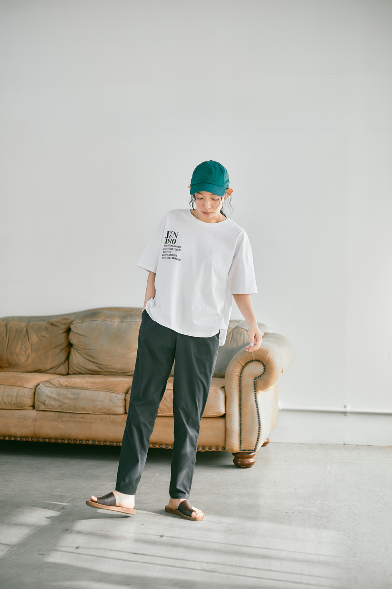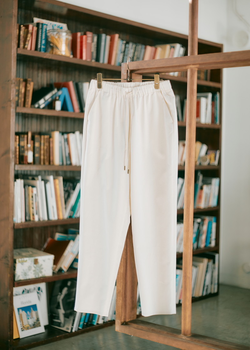 パウダー状にしたオイスターシェル(牡蠣殻)を用いたリサイクル素材で仕立てたテーパードシルエットのイージーパンツです。エコ視点だけでなく、抗菌・消臭機能が期待でき、肌あたりの良さも◎。ウエストは総ゴム仕様で着脱が楽。デイリーに使い勝手の良いボトムです。オフホワイトとグレーの2色展開。