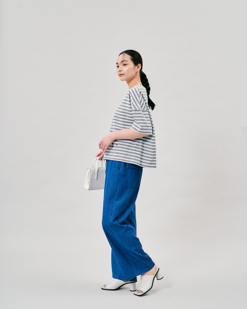 マイルドなカラーリングとナチュラルな風合いがポイントのボーダーTシャツ。花や植物の茎や根を使った天然染料で染め上げた「PLANT DYEING(プラントダイ)」のカットソー生地は、自然由来の染料だからこそ出せる絶妙な色合いが魅力的。着こなしに抜け感を出せるショルダーダウンシルエット、広めの身幅でゆとりのあるサイズ感です。裾にはJANTZENのアイコンである”ダイビングガール”の刺しゅう入り。