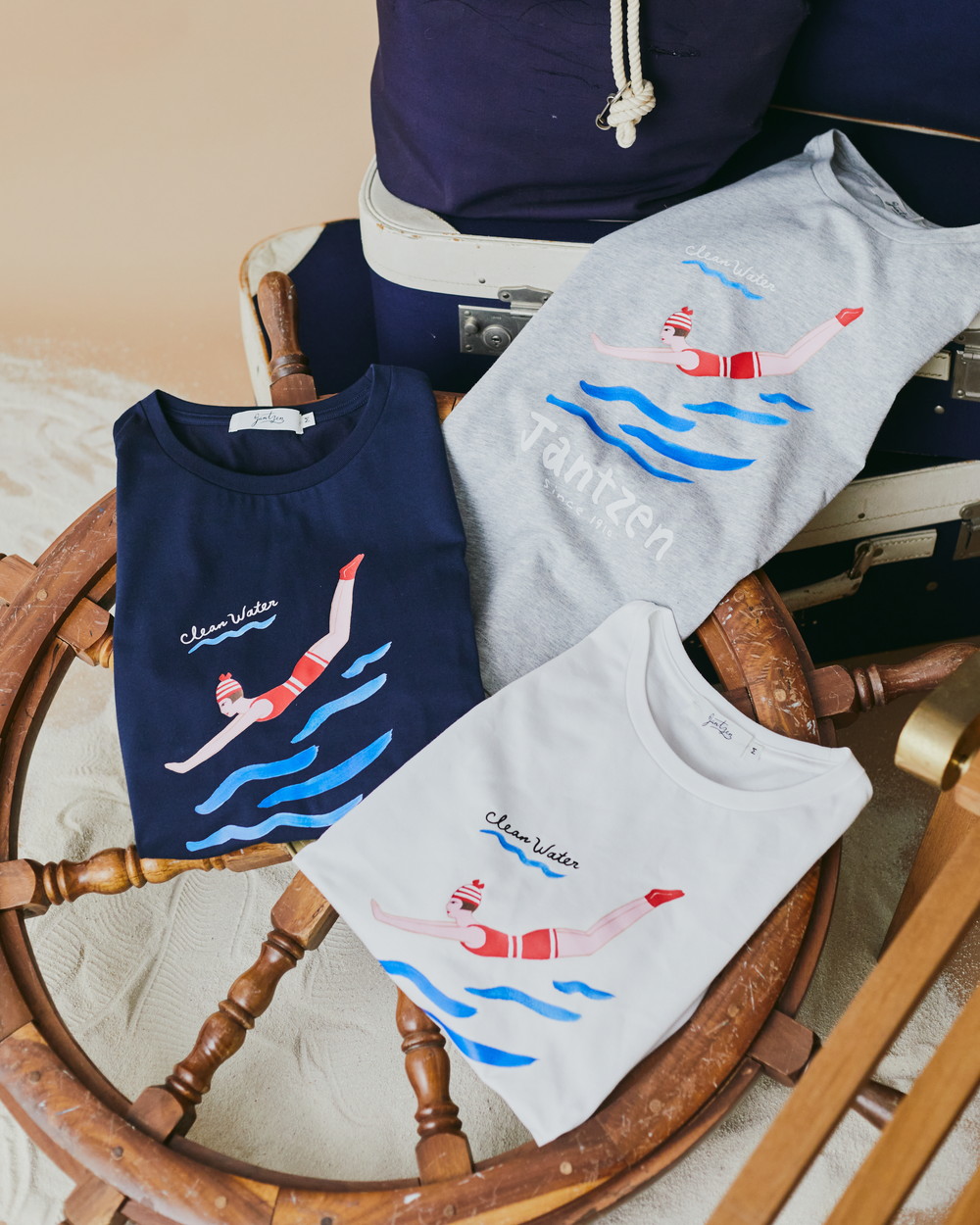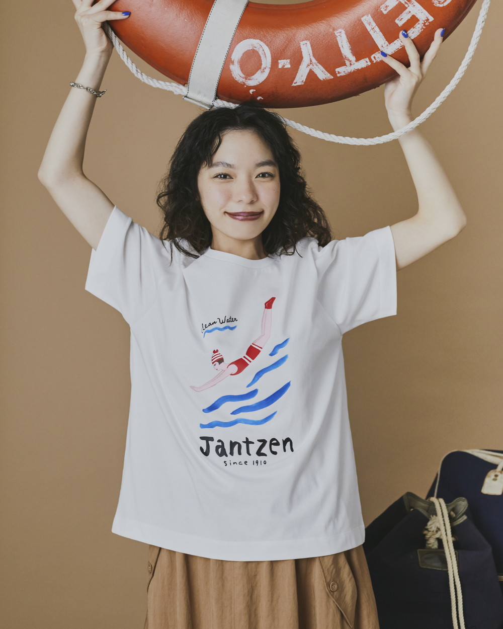 JANTZENならではの「DIVING GIRL Tシャツ」。ブランドのアイコンとしてお馴染みの“ダイビングガール”を網中さんに描いていただきました。ゆるやかなタッチのペイントで表現されたダイビングガールは、どこか物語を感じさせるような趣が素敵。波の筆致や涼しげな色使いも夏の装いを彩ります。適度なちょっぴりマリンな着こなしでダイビングガール気分を味わってみては?