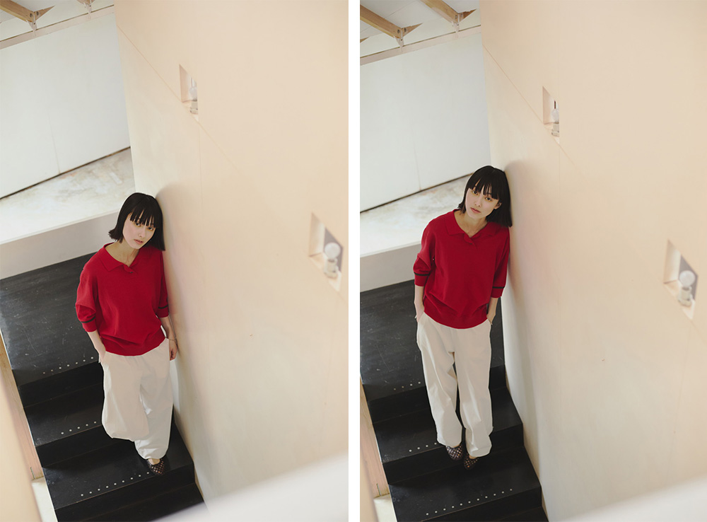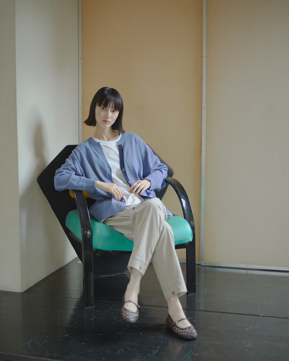 キーネックカーデ¥9900、テーパードパンツ¥9900