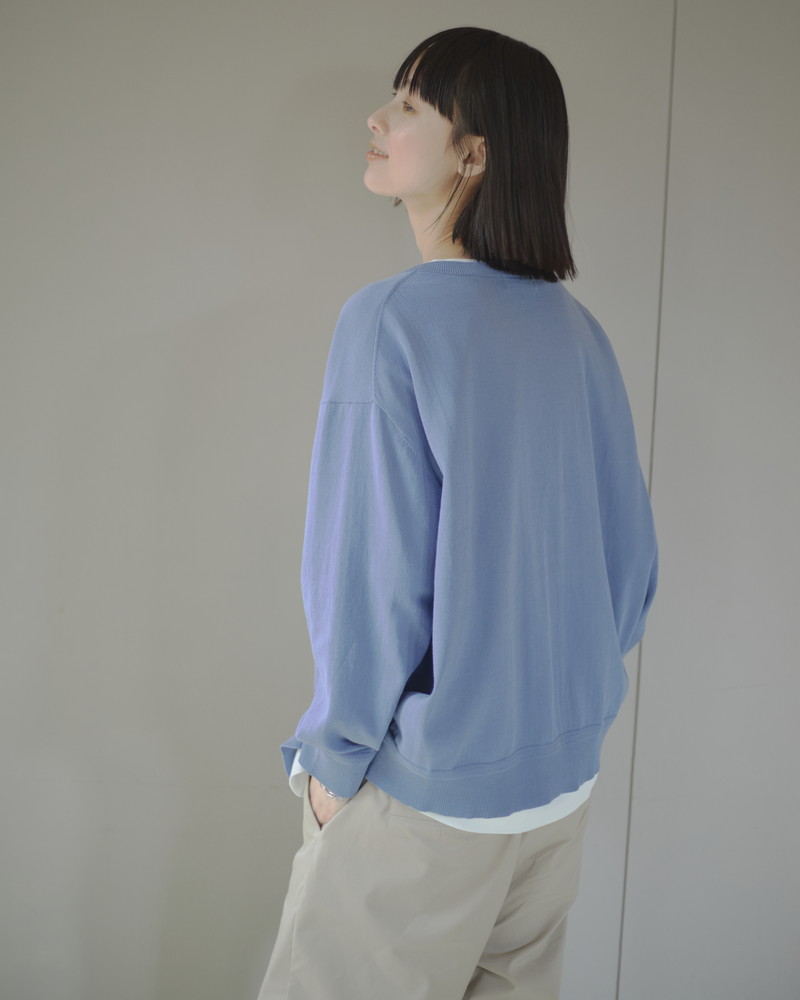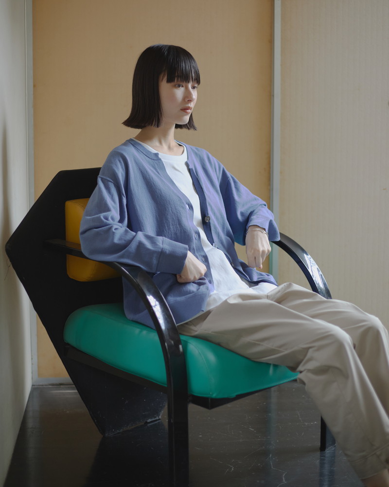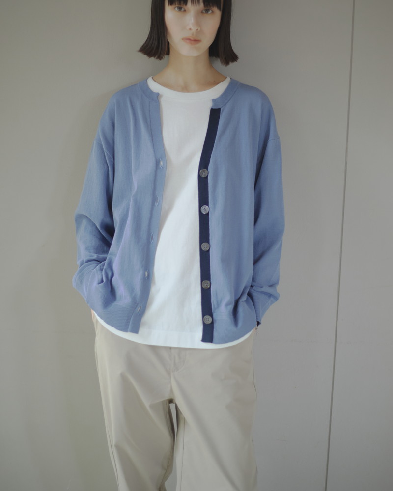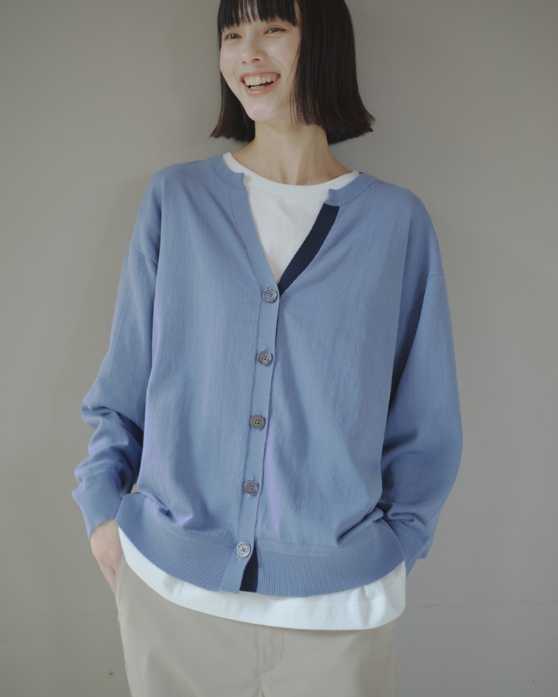 さらっとした肌触りが特徴のハイツイストコットンを使用した薄手のハイゲージカーディガン。配色の下前立てがスタイリングのアクセントに。顔回りをすっきりと見せる深めのキーネックもポイントです。前ボタンをすべて閉じて、プルオーバー風に着用するのもおすすめ。ダルブルー(モデル着用)とグレーの2カラー展開。同素材、ハイツイストコットンのニットポロ(401R8600)も。