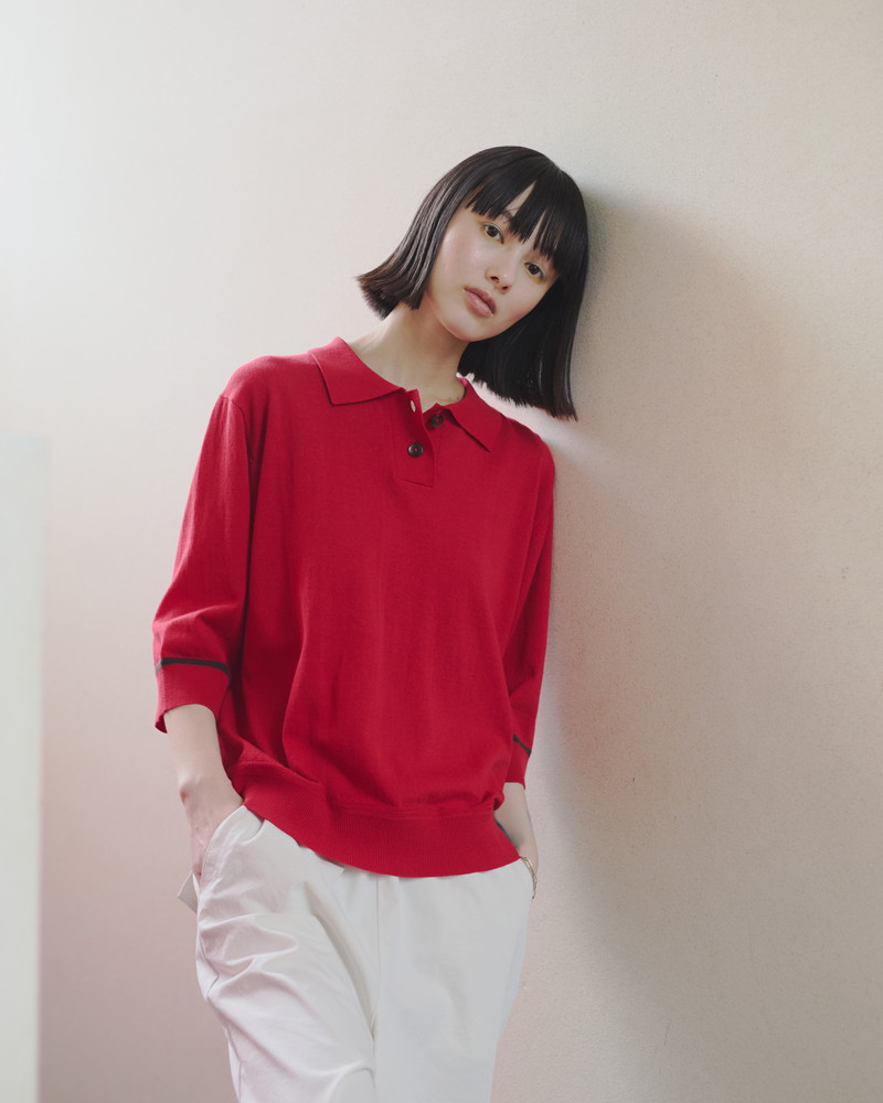 ポロ襟のデザインが印象的なハイゲージプルオーバー。コーディネートを印象的に引き締める袖口の配色ラインもポイントです。半袖よりやや長めの7分袖で秋口のスタイリングにも◎。さらっとした肌触りが特徴のハイツイストコットン系を使った薄手で肌離れの良いニット地で仕立てているので、サマーシーズンでも涼しく着用できます。レッドとカーキの2カラー展開。同素材、ハイツイストコットンのカーディガン(401R8601)も。