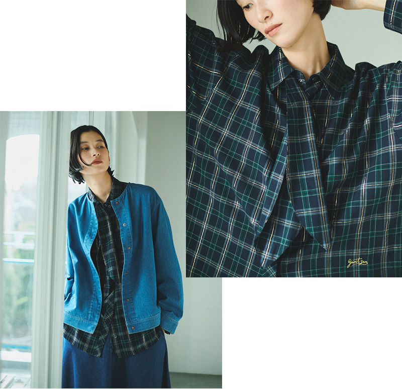 カポックデニムジャケット¥13200、ラメチェックボウタイ付きブラウス¥9900