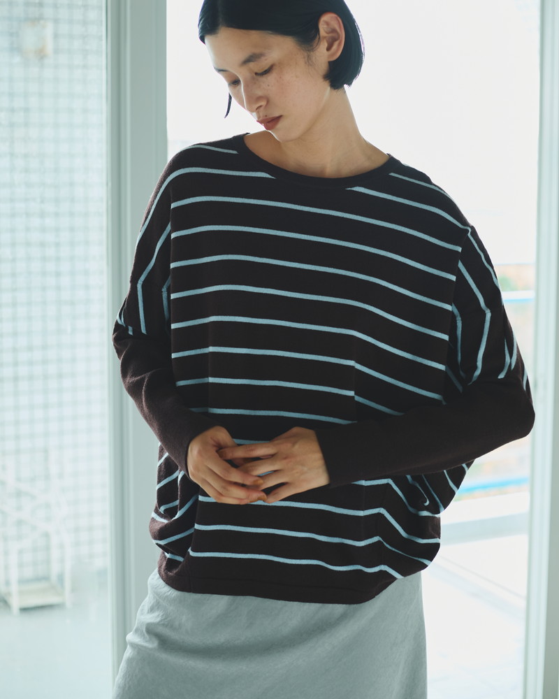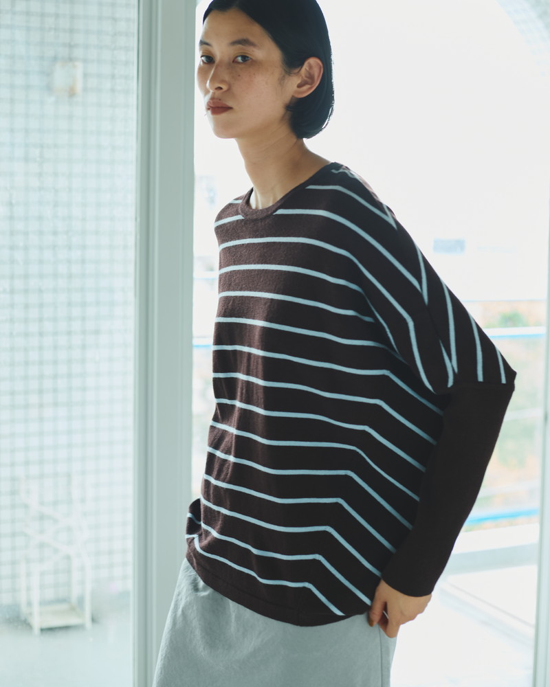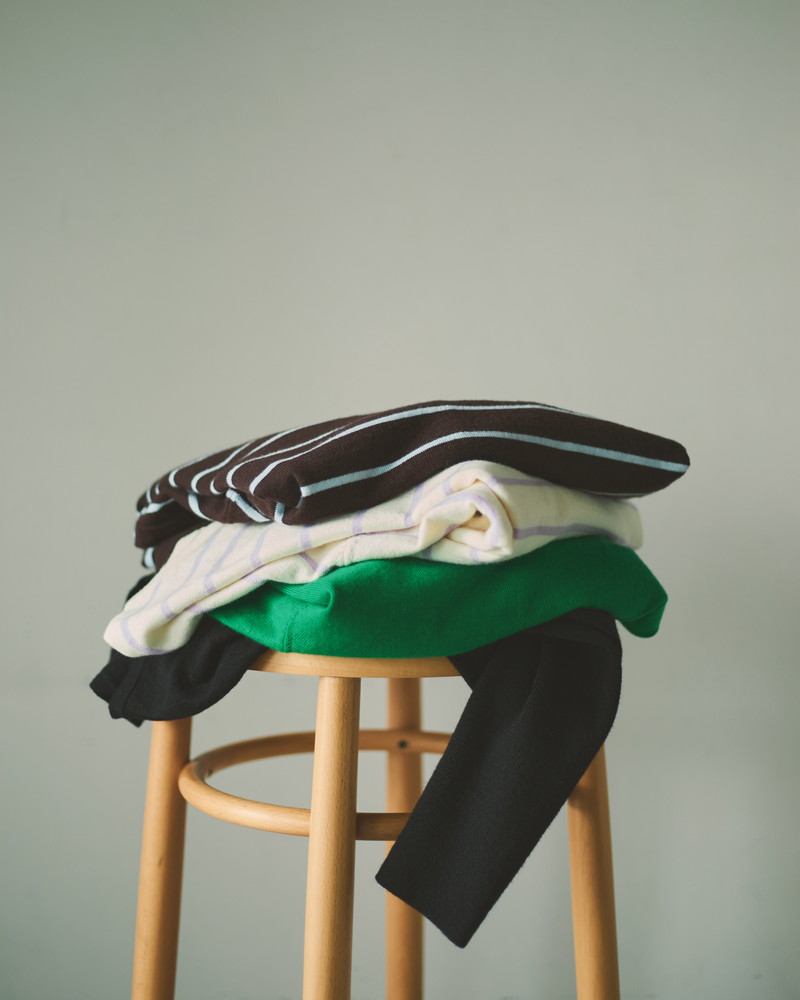カラーは、ボーダー柄2種・無地2種のラインナップ。すべて今季の新色で、ボーダーは、〈ブラウン×アイスブルー〉〈クリーム×パープル〉の配色、無地はコーディネートにアクセントを添える〈グリーン〉とベーシックで合わせやすい〈ブラック〉の展開です。1枚目はベーシックに、2枚目にはカラーで遊ぶのもおすすめ。