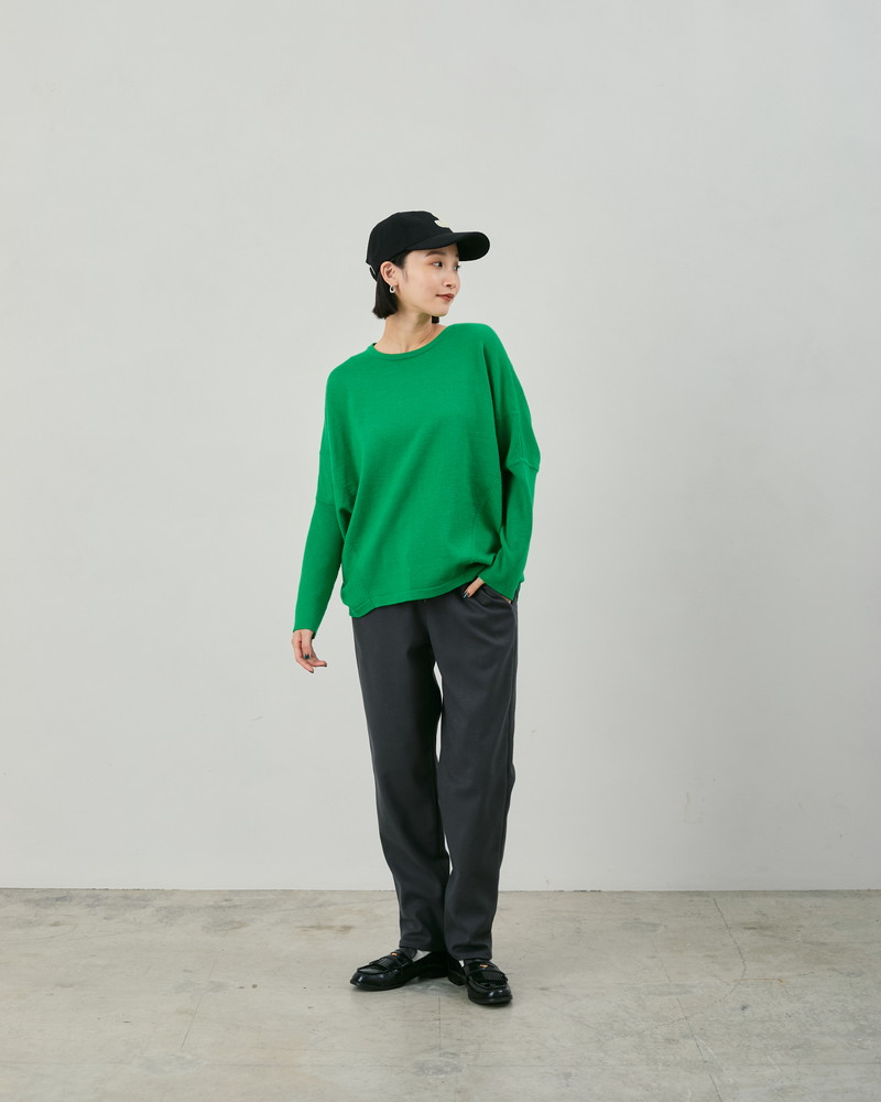 カットソー感覚で着られる薄手のウール混ハイゲージニット。1枚でも重ねても使えるユースフルさが魅力です。落ち感のあるたっぷりめの身幅と袖口のロングリブがポイントで、シンプルながらどこかお洒落に見えるバランスにこだわりました。また、今年はネックラインをクルーネックへ変更し、汎用性の高さもアップデート。プライスも見直し、昨年より手に取りやすい価格に変更しました。