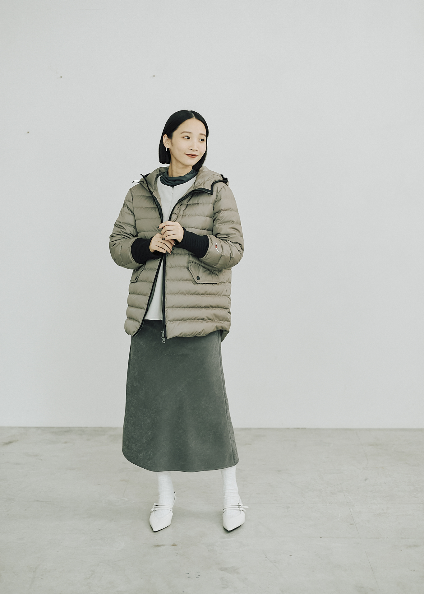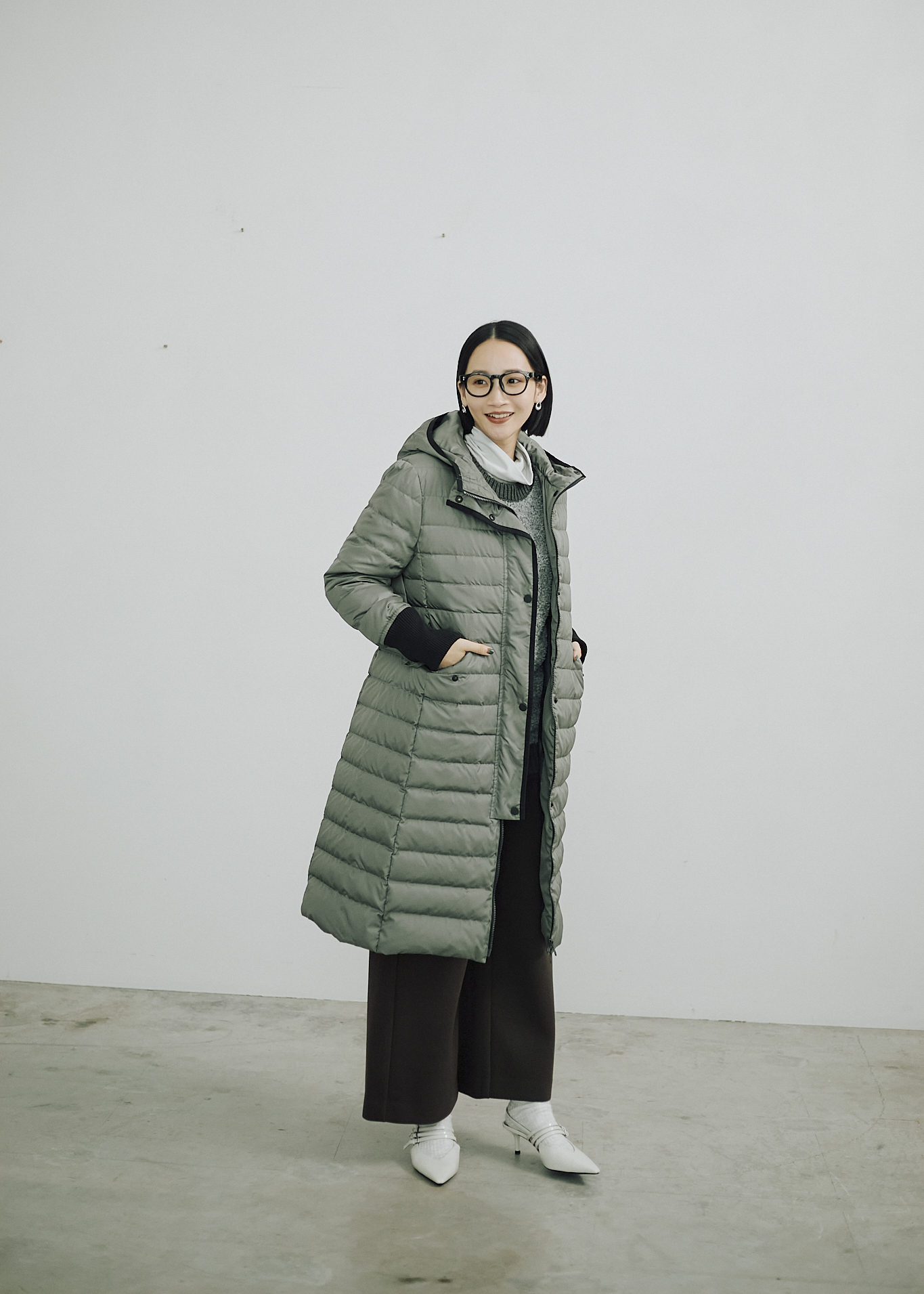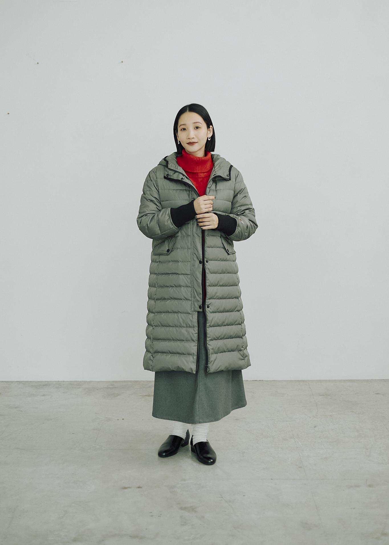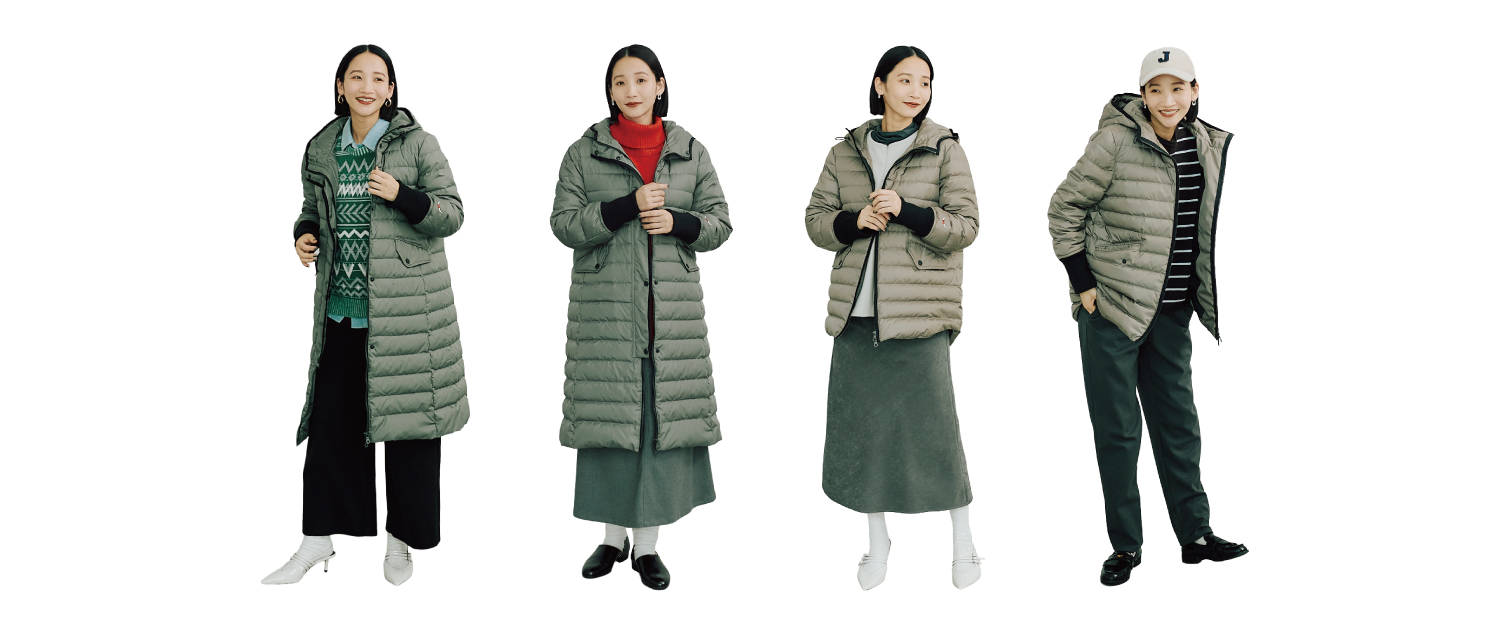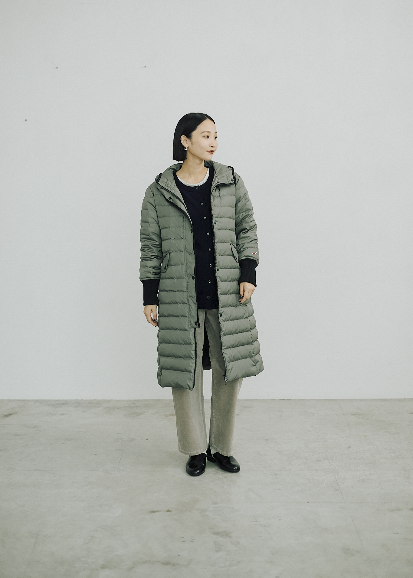 例年、好評いただいている「河田フェザー」の高品質なリサイクル羽毛「グリーンダウン」を使用したJANTZENのダウンアウターに、今年は膝丈の「フードロングダウンコート」が登場。軽くて暖かく、デイリーに使える万能アウターです。カラーは、今回着回すカーキのほかに、ネイビーも展開。