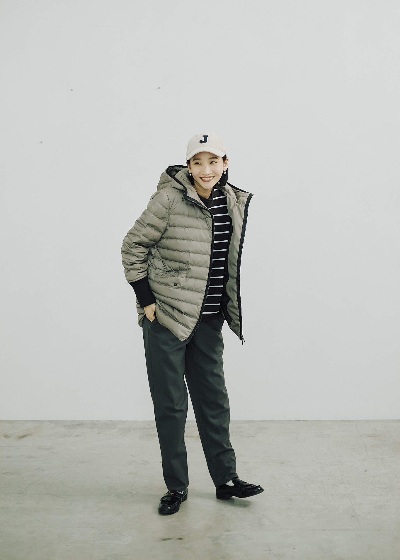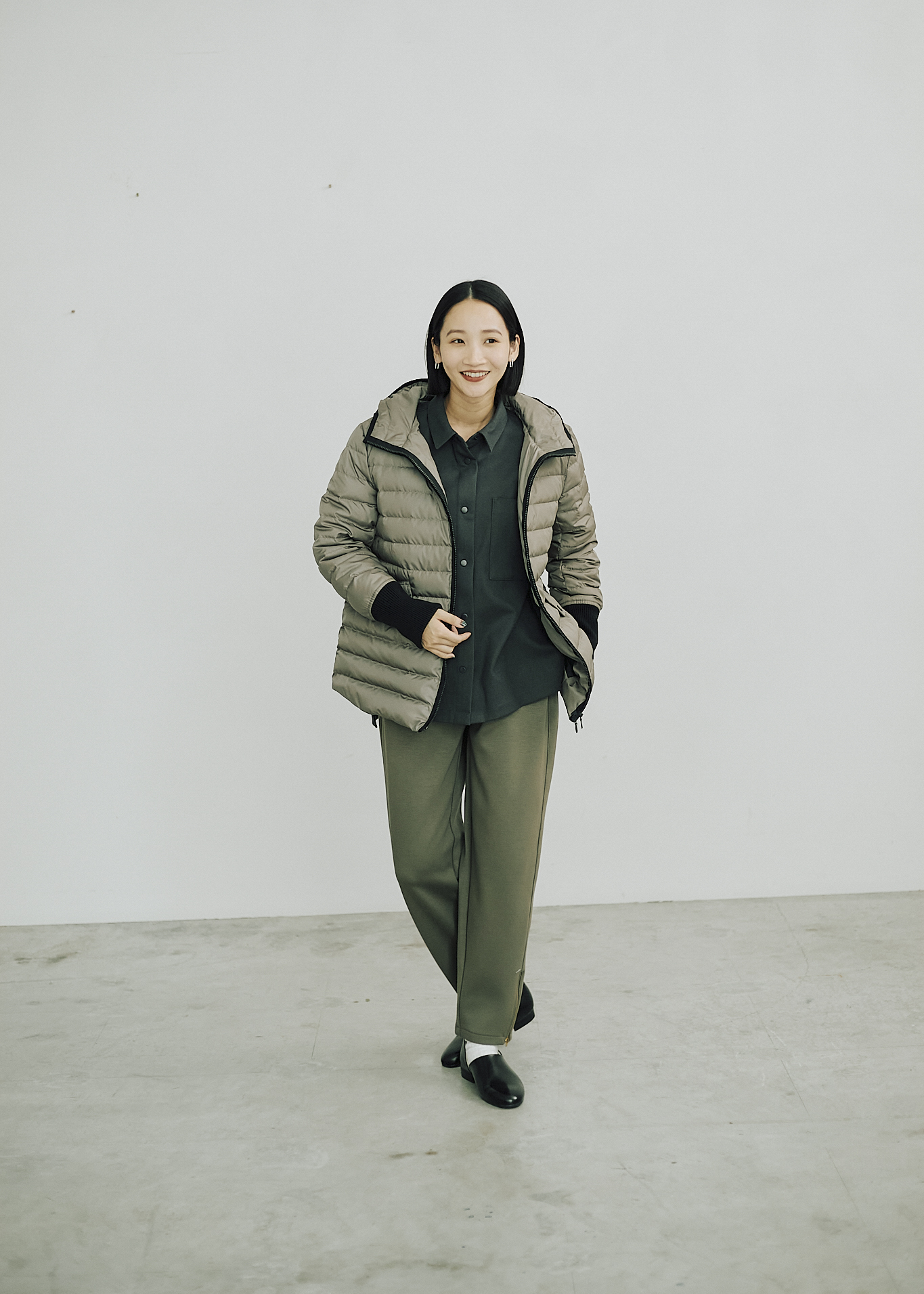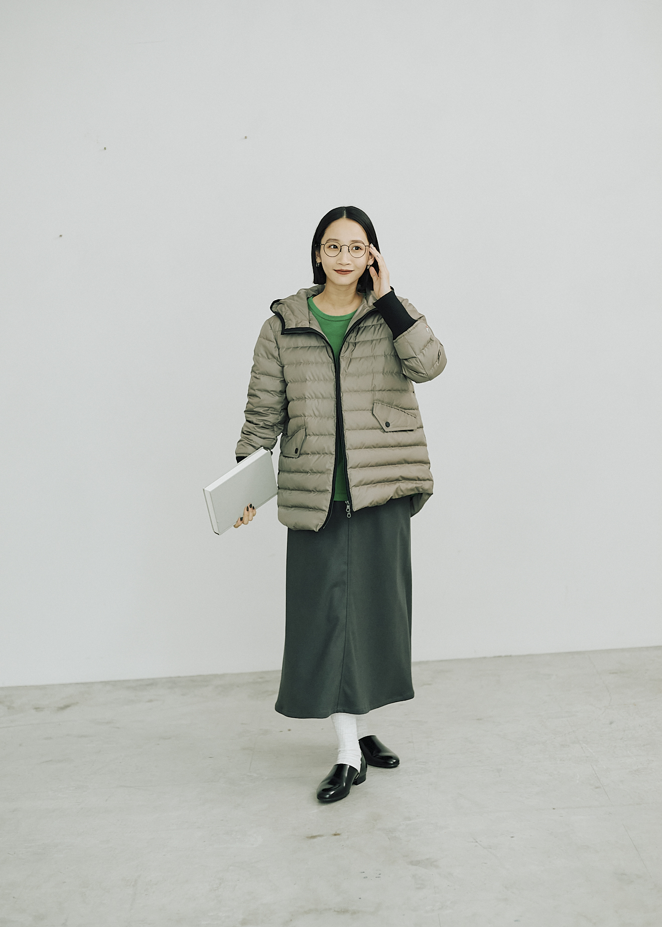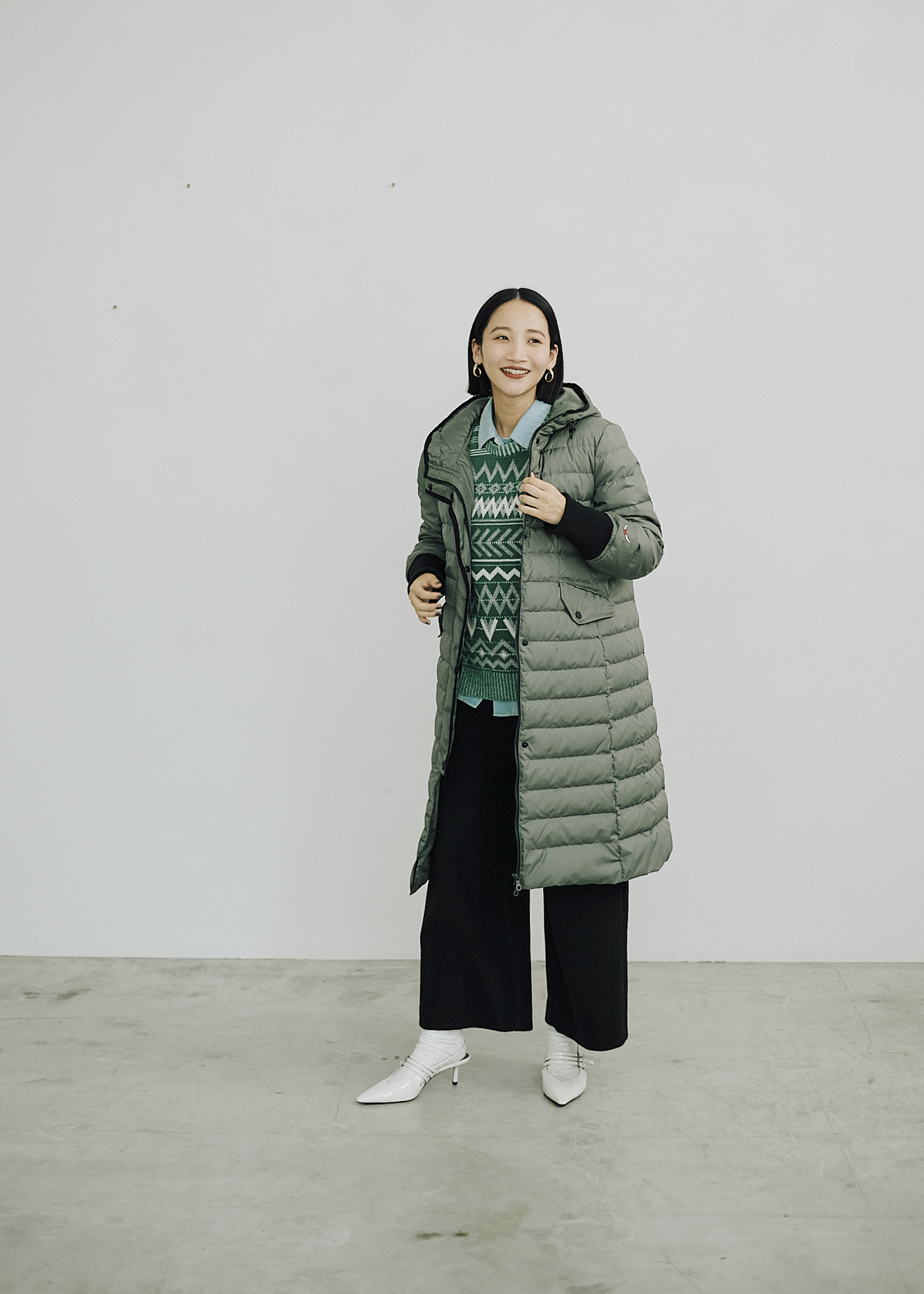 例年、好評いただいている「河田フェザー」の高品質なリサイクル羽毛「グリーンダウン」を使用したJANTZENのダウンアウターに、今年は膝丈の「フードロングダウンコート」が登場。軽くて暖かく、デイリーに使える万能アウターです。カラーは、今回着回すカーキのほかに、ネイビーも展開。