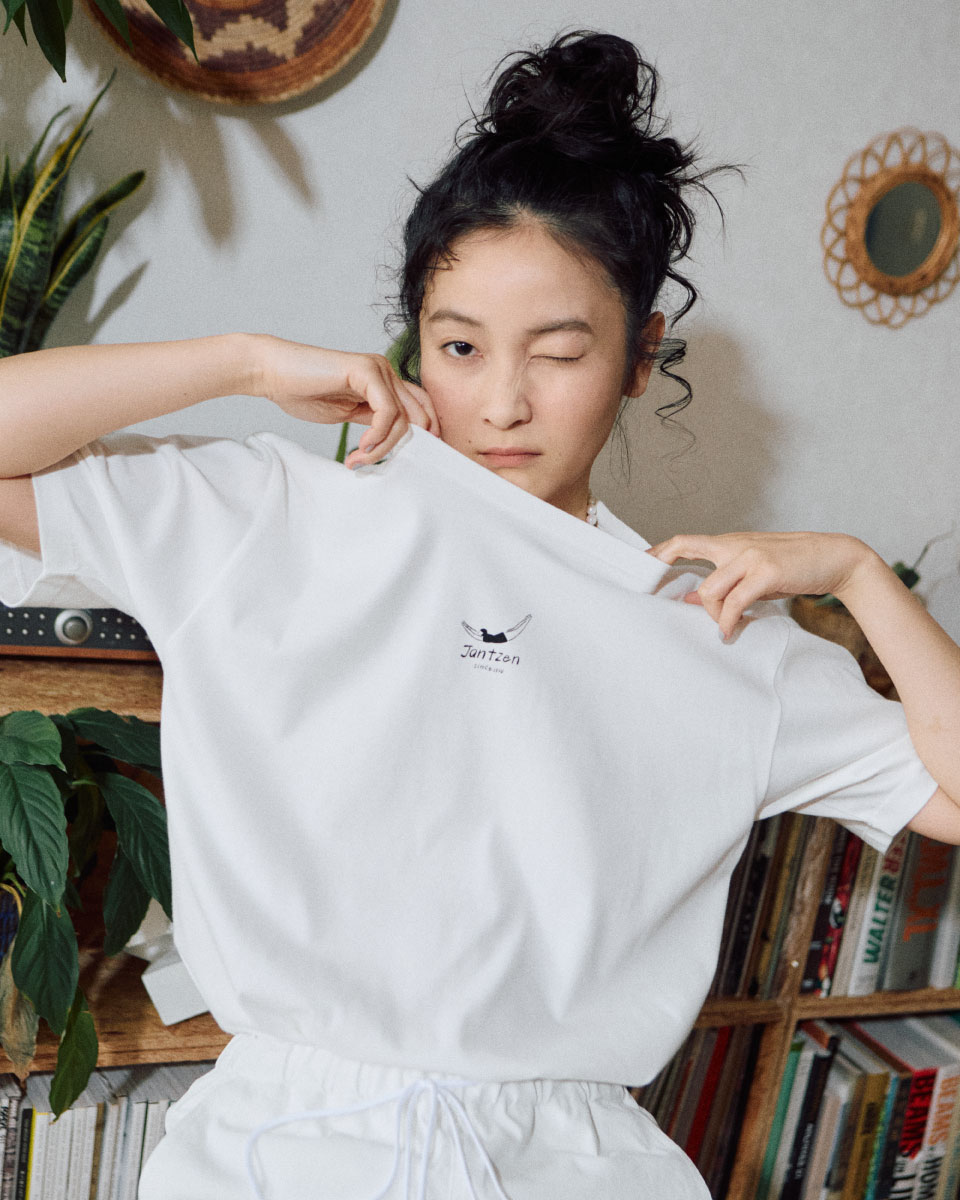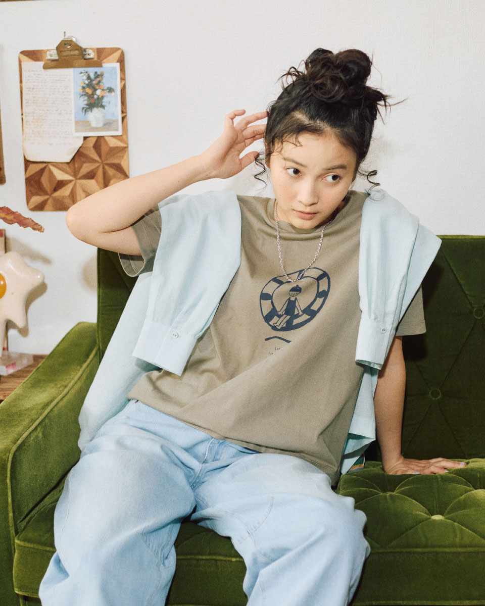 アイコンのダイビングガールを、Killdiscoさんならではのタッチで描き下ろした一枚。浮き輪にちょこんと腰かけた姿が、どこかユーモラスで愛らしい表情に。バックスタイルにもプリントを施し、後ろ姿まで抜かりないデザインに仕上げました。吸水速乾・UVカット機能を備え、デイリーにもアクティブにも活躍します。