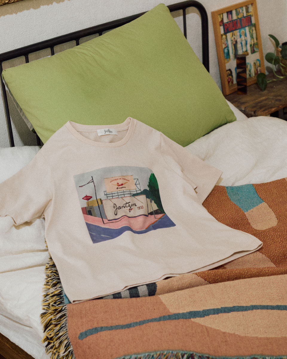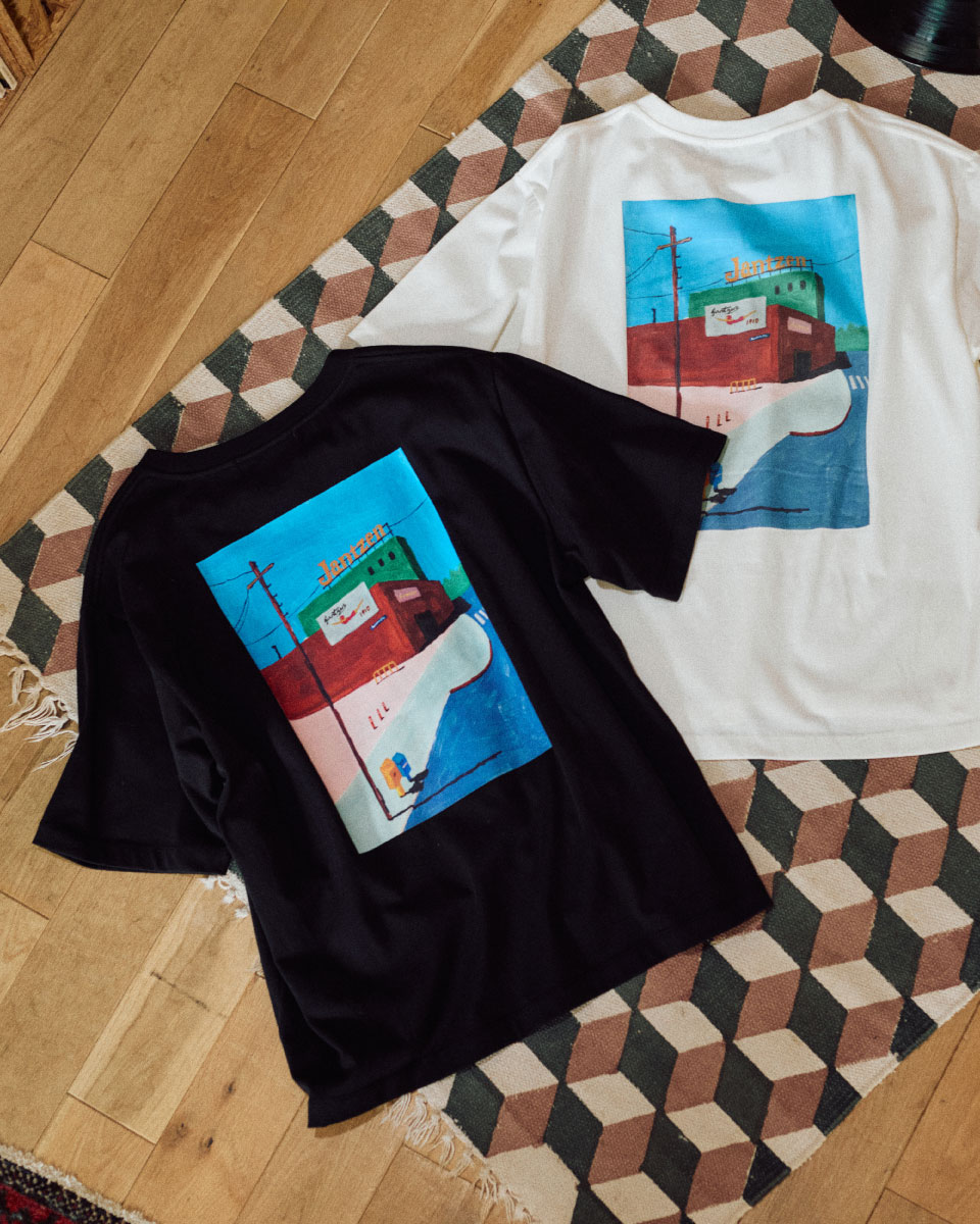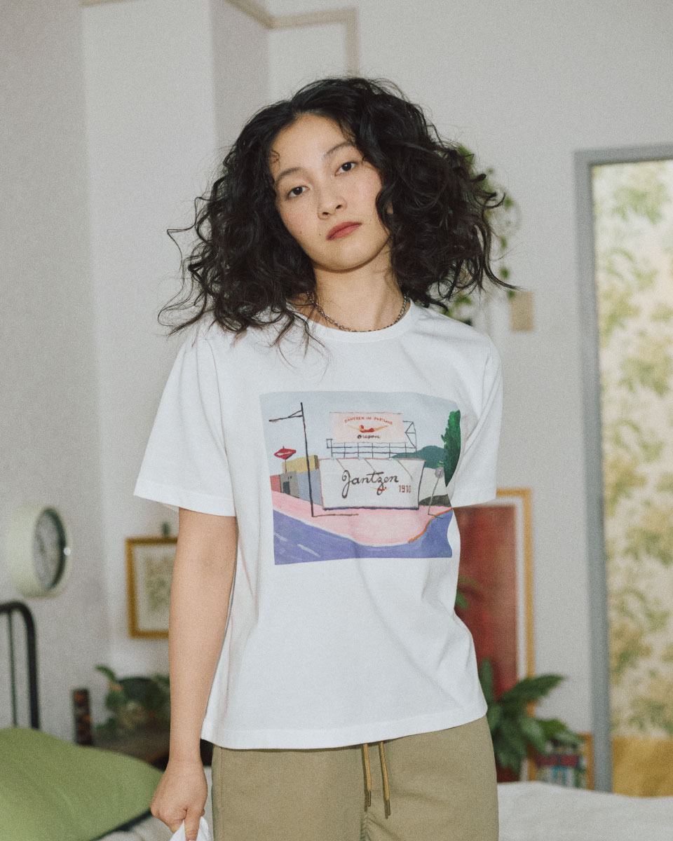 Map上でバーチャルにポートランドを旅しながら街角を描いていただいたTシャツです。クリアな空と抜け感のある街並み、Jantzenのサインボードもさりげなく配され、旅するような気分を楽しめる一枚。フロントにはロゴプリントをあしらい、シンプルな中にアクセントを効かせました。吸水速乾・UVカット素材で、これからの季節にも快適に。