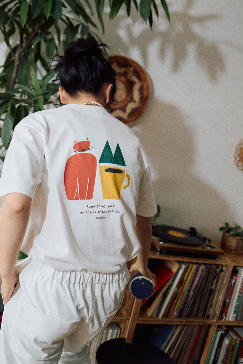 「今回のTシャツのために2つの作品を書き下ろしました。まずは、JANTZENのロゴマークでお馴染みの“ダイビングガール”が浮き輪に座ってくつろいでいるイラスト、もうひとつは、“のんびりした時間から何かいいことがうまれるでしょう”というメッセージとともに、コーヒーや森といったポートランドに関するモチーフと猫を描いた作品です。どちらも少しオフビートで、のんびりとした空気感の漂うモチーフに仕上がっています」(イラストレーター・killdiscoさん)