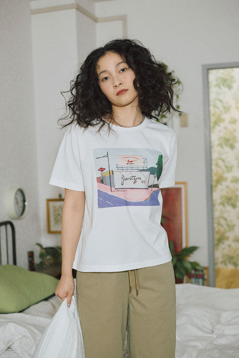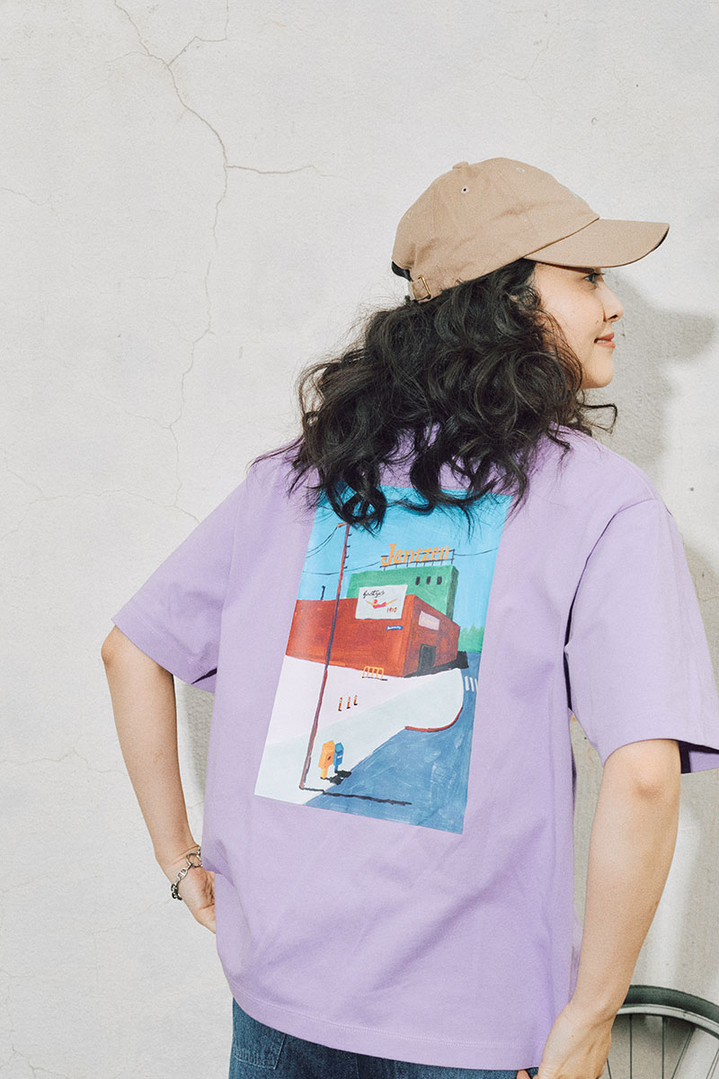 見応えのある辰巳菜穂さんの描き下ろし作品をJANTZENのオリジナルボディに落とし込みました。ブランド発祥の地である、アメリカ・ポートランドの街並みをモチーフにしたペイントが着こなしを彩ります。「ポートランドバックプリントTシャツ」は、辰巳さんの解釈も交えた夏のSW Morrison Stを思わせるロケーションが描かれ、クリアな空と抜け感のある街並みが印象的。さりげなく配されたJantzenのサインボードもポイントです。前身頃にはJANTZENのロゴプリント入り。本体は、吸水速乾&UVカット加工素材使用で、機能面も◎。