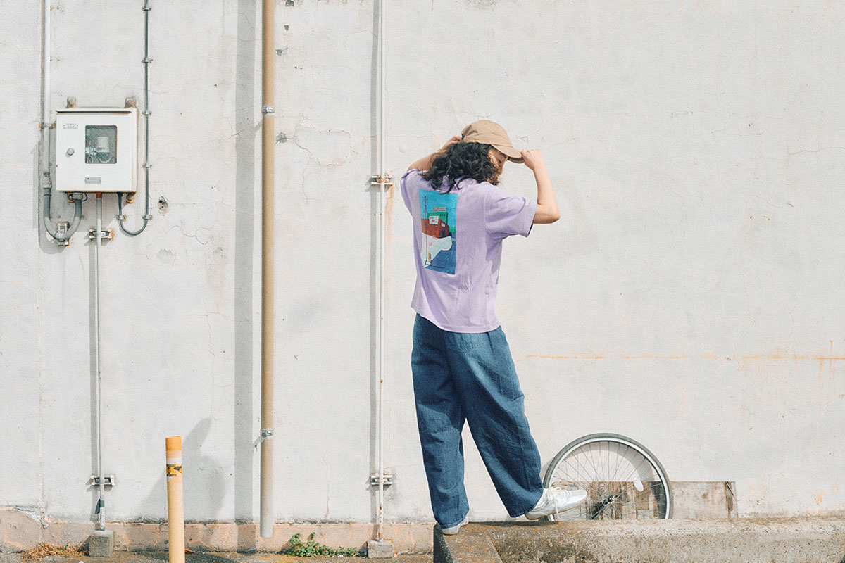 「普段から自分の作品の色合いのような着こなしをしていることが多いです。こちらのTシャツはパープルのカラーを選びたい。オレンジや黄緑のワイドパンツと最近お気に入りのスニーカーを合わせて、仕上げにベージュのキャップをかぶってコーディネートするのが気分です」(辰巳さん)