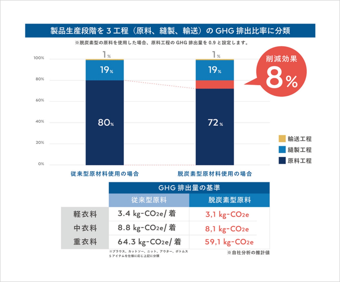生産時の環境負荷を低減したオーガニックコットンなどの素材、ペット ボトルをリサイクルした資源循環型の素材、羽毛を回収して再商品化する 「グリーンダウンプロジェクト」にも賛同。
