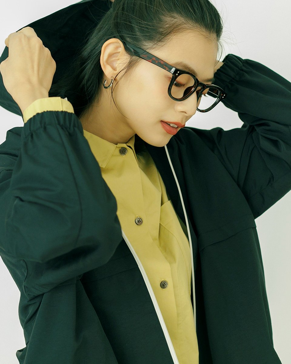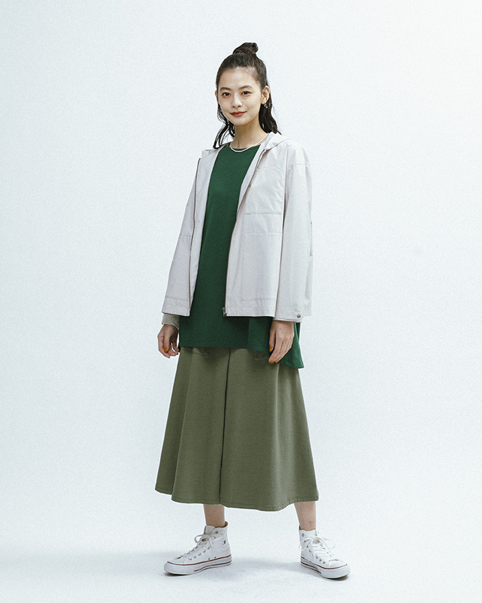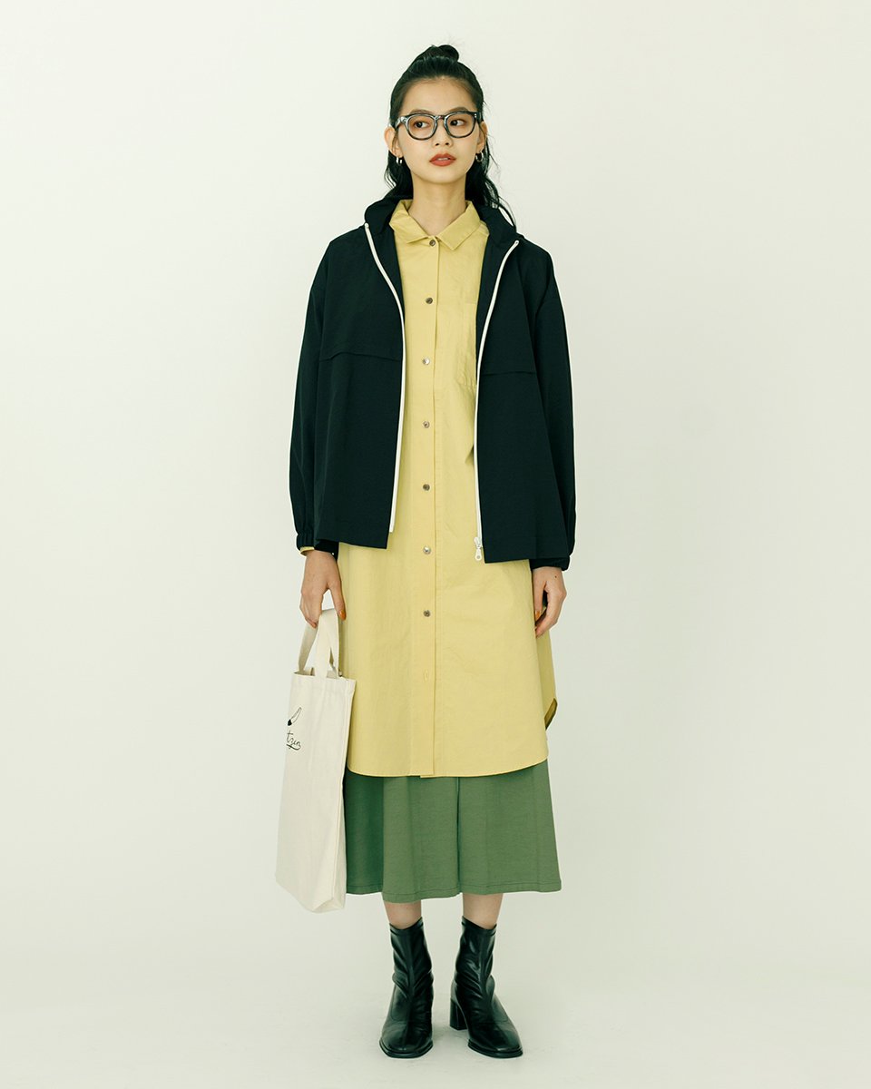 シャツワンピのようなロング丈にも合わせやすく、 フードがスタンド衿に収納できるタイプで顔周りがスッキリ。