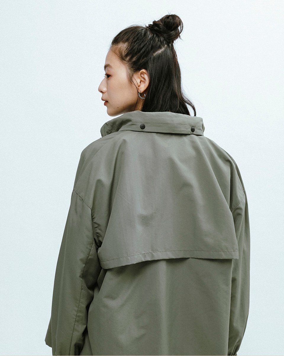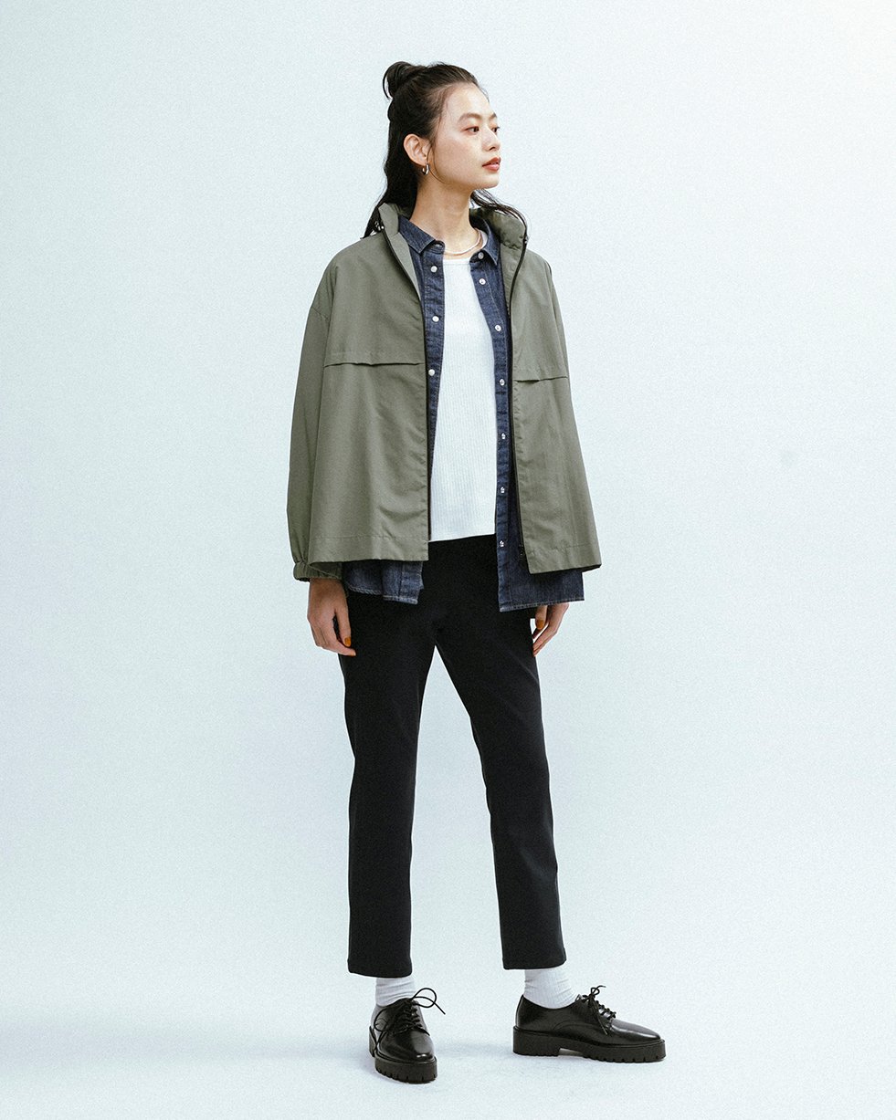 シンプルなディテールでありながら、今年らしい分量感、シルエットのパーカ。撥水加工された素材を使用しているので、雨の日のも安心。トレンドに左右されないシルエットでパンツでもスカートでも合わせやすく、持っていると便利な1枚です。
