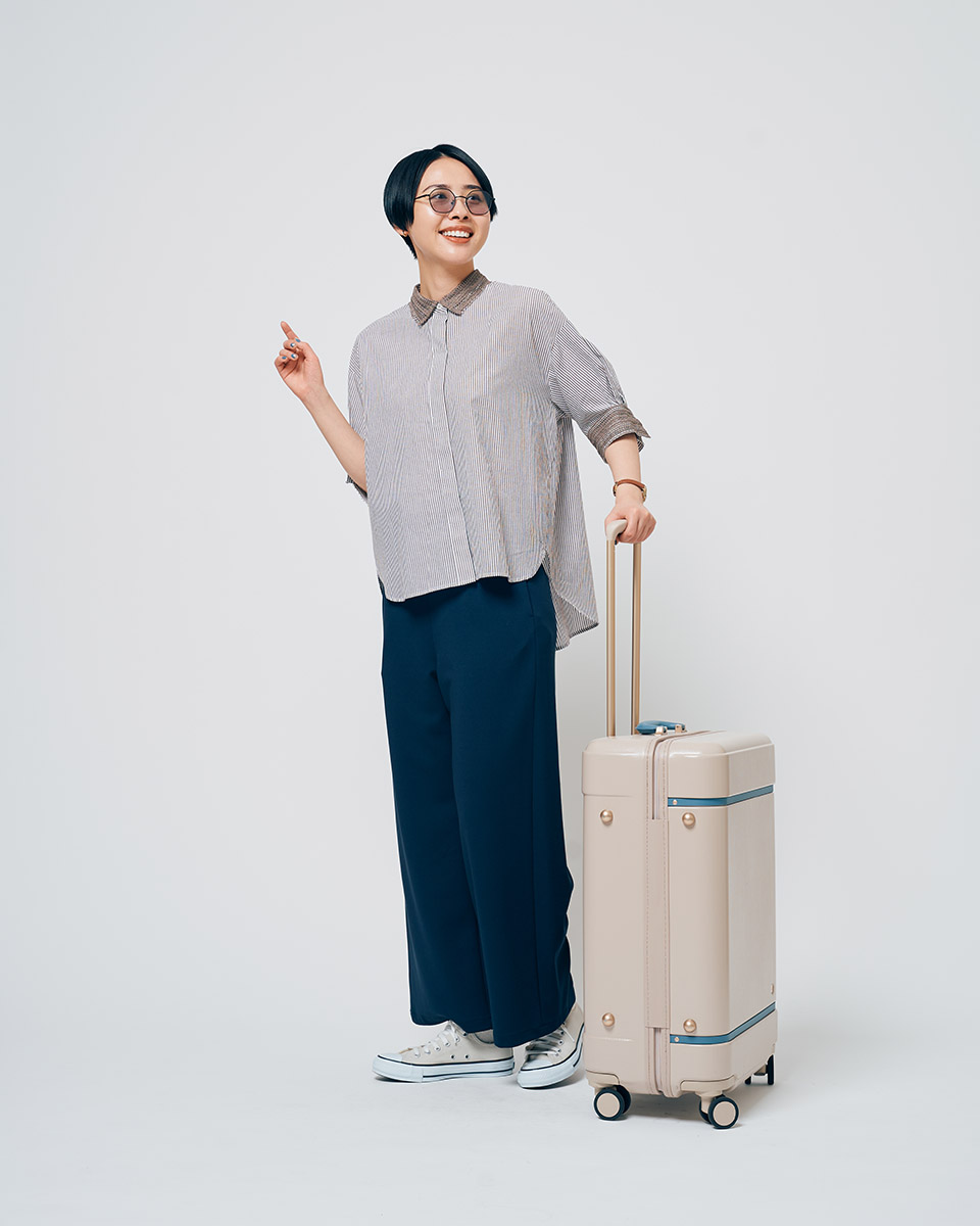 ウエストゴム入りのポンチ素材のパンツは、動きを妨げないストレスフリーなはき心地。移動の多い旅行時に大活躍間違いなし!トップスにはレース使いの5分袖シャツを合わせて大人フェミニンに。旅行先での写真が楽しみになるコーデ。