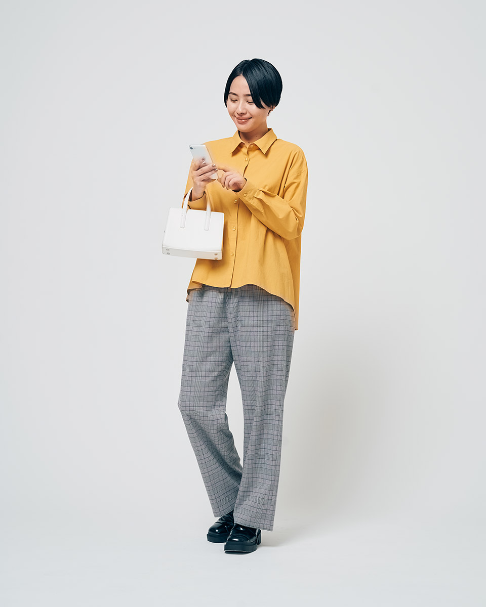 気心の知れた友達との久々の休日ランチには、肩ひじ張らないコーディネートで軽快に。ちょっときちんと+ちゃんとこなれた感じに見えるグレンチェックのパンツに、シンプルだけどあざやかなイエローのシャツを合わせたら、楽しい会話に笑顔の花が咲きそう。