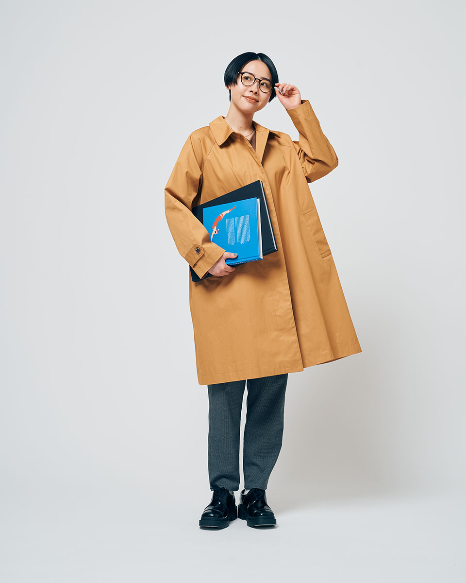 知的な印象のコーディネートでアートを楽しむなら、ステンカラーコートをさらりと羽織って。インナーには顔立ちをきりっと見せるVネックをチョイス。かっちりとしたアイテムでまとめて、いつもと違う雰囲気を楽しんで。