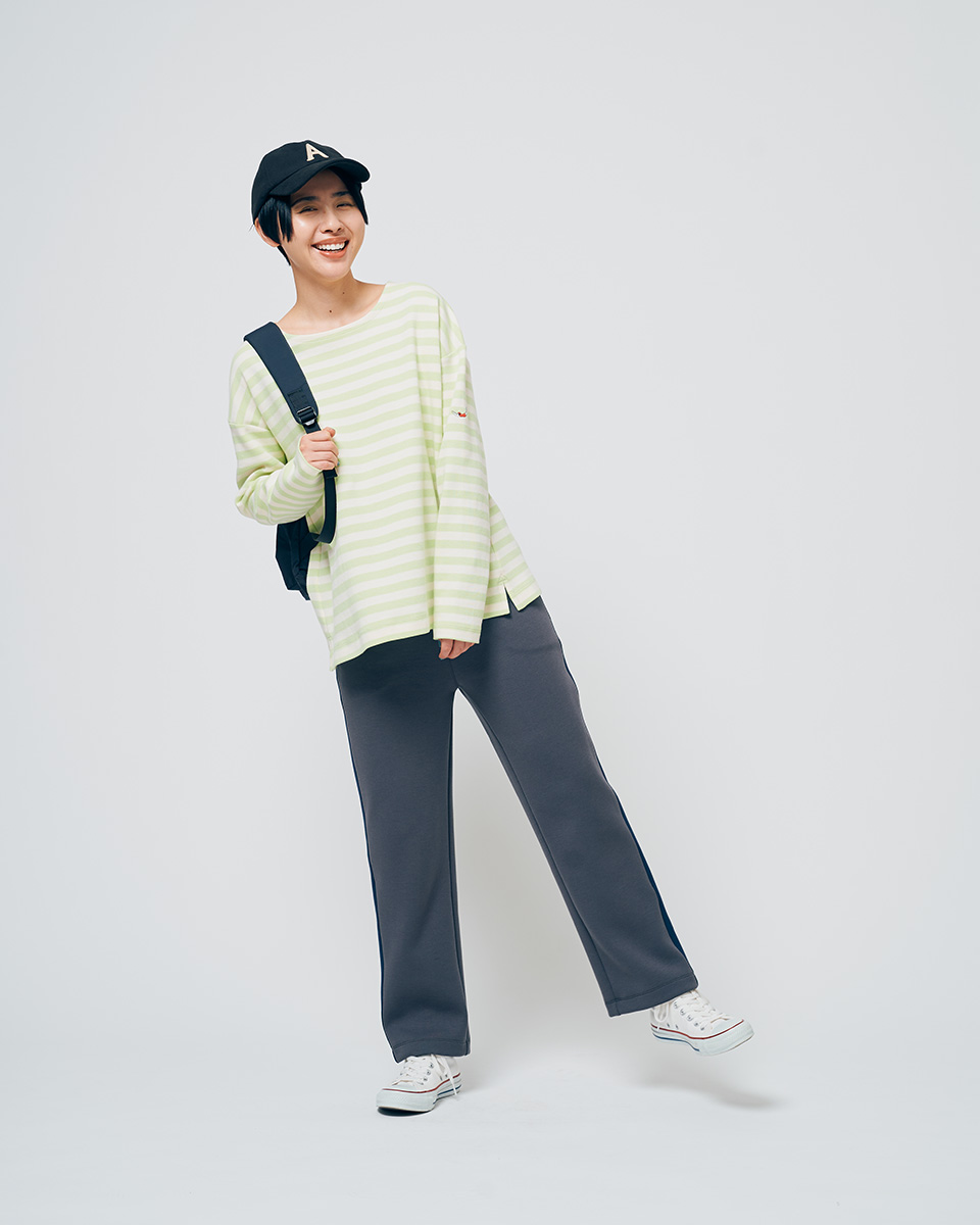 スポーツ観戦に行くなら、とことんスポーティに!動きやすいラインパンツをメインにトップスにはボーダーカットソーをチョイス。ベースボールキャップ&スニーカーをプラスしたら完璧!ポップなイエローグリーンのボーダーが応援をお手伝い。