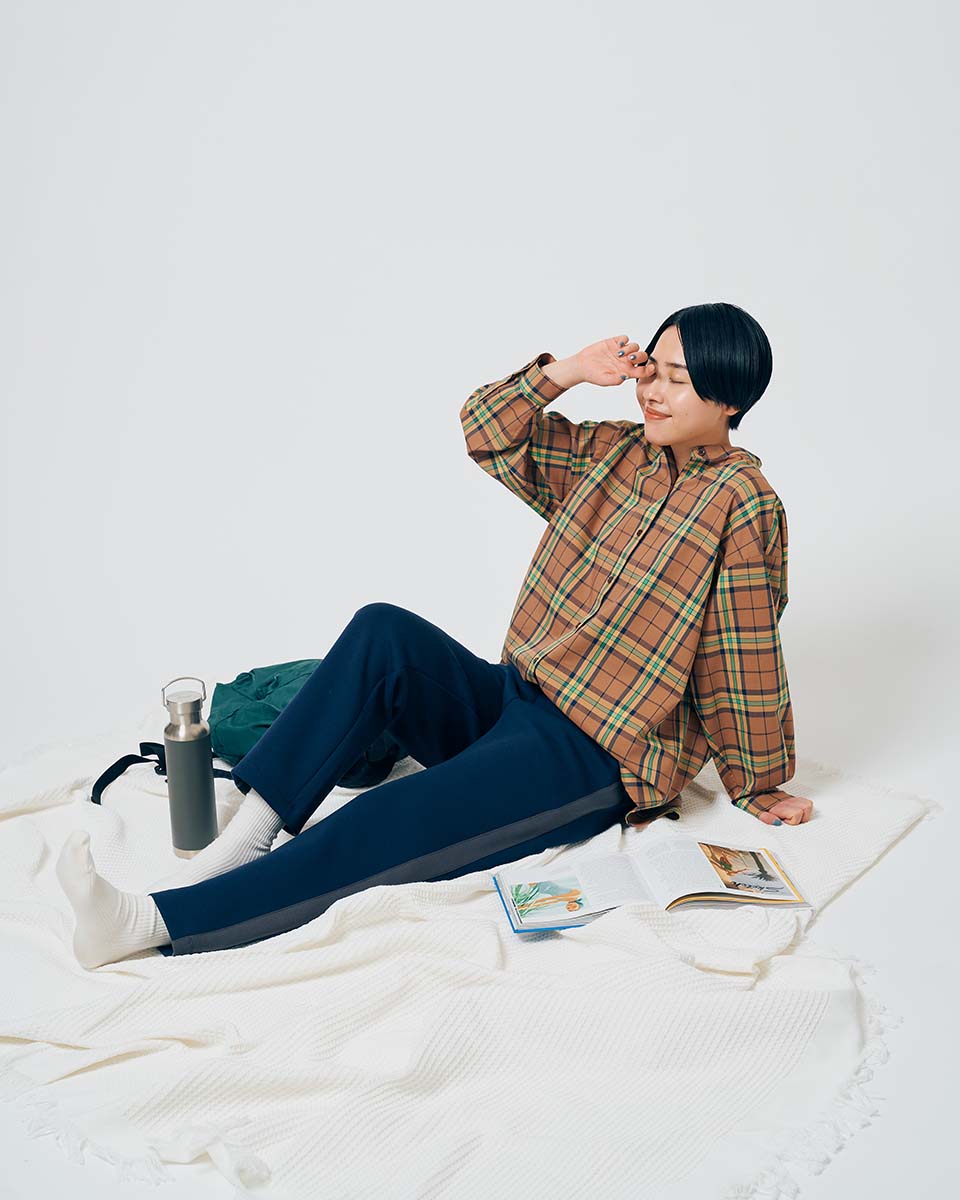 天気の良い週末にピクニックに行くならストレッチ性のあるダンボールニットのパンツに、リラックスシルエットのチェックシャツを合わせて。動きやすいので地面に座っても楽チンで、ゆったりとした時間の流れと自然を感じられるはず。