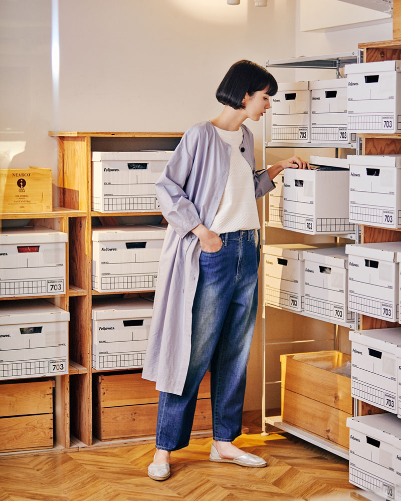 ボタンのカラーや裾脇のマチで遊びを入れてます。