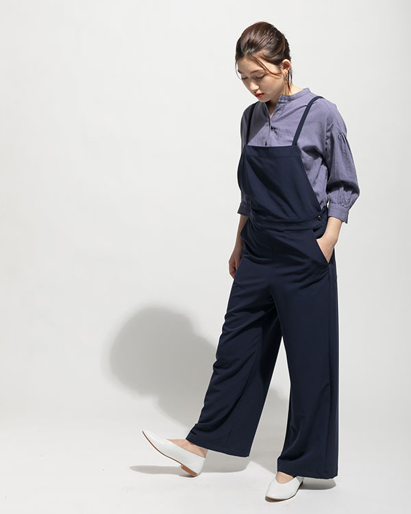 正面はスッキリ見えるデザインでありつつ、ゆったりしたパンツラインに。 体のラインを拾わずにきれいなシルエットに仕上げています。 後ろのボタンで肩紐の調節をしていただけます。