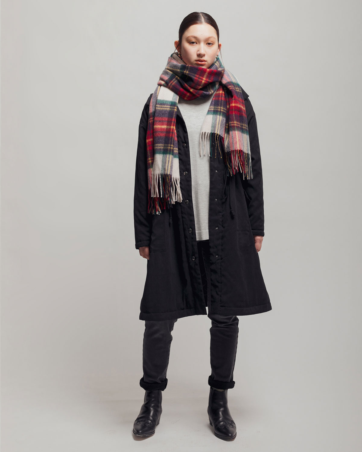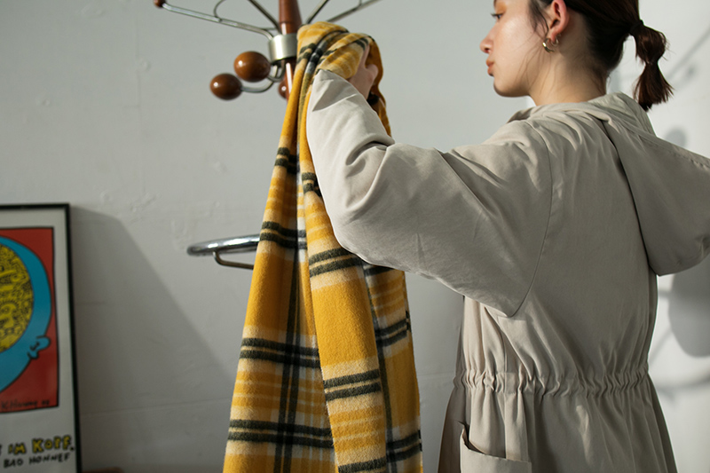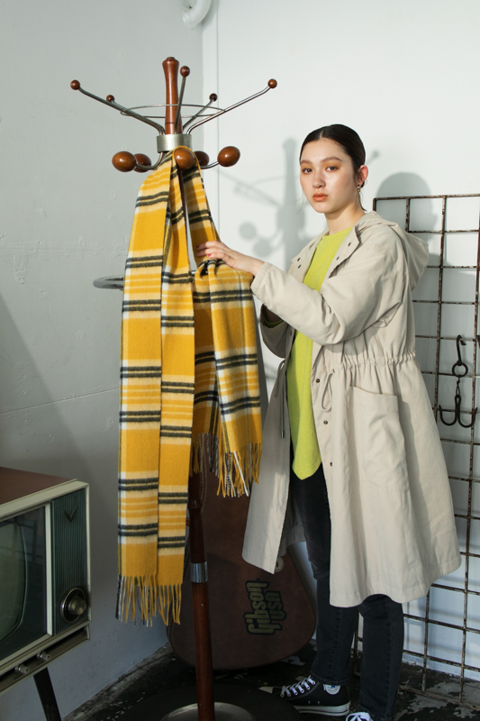 シンプルなデザインなので、 キレイなカラーの小物とも好相性。 使い勝手のよいアウターです。