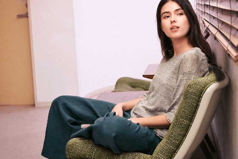 袖と裾に入れたフリンジがポイントのVネックプルオーバーは、麻素材ならではのこなれ感が魅力。スタイリングが大人っぽく引き立ちます。同じくパンツも麻素材で、装い慣れた大人のオフスタイルに。